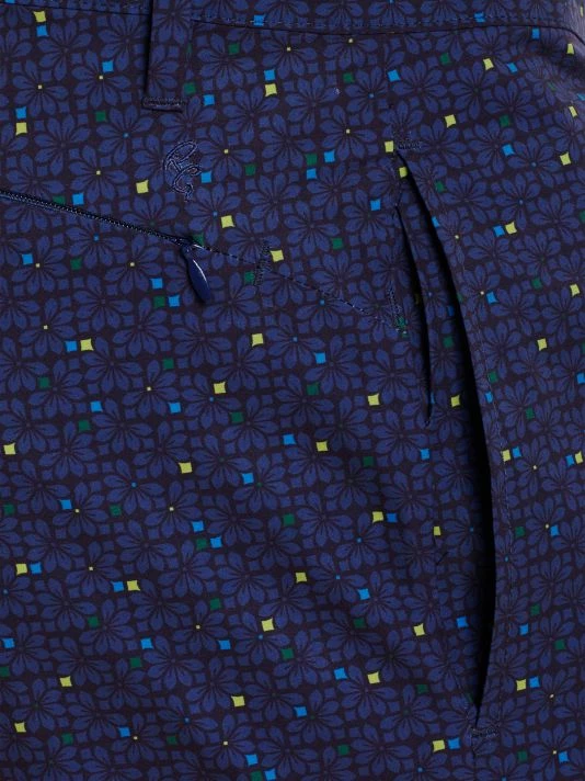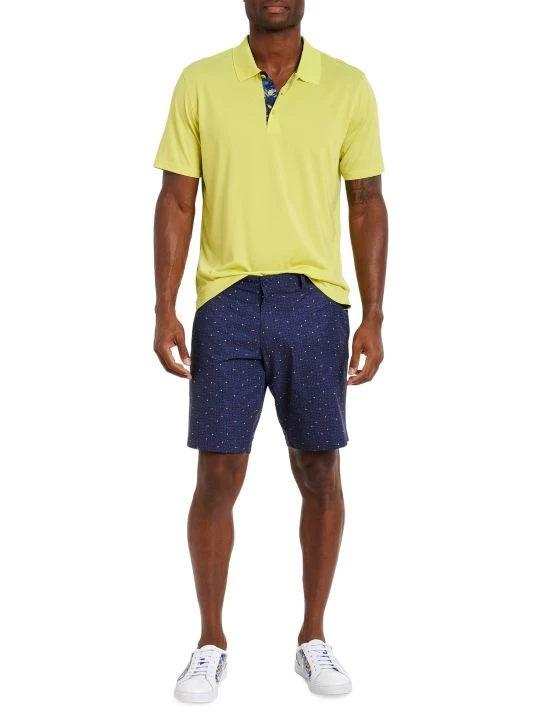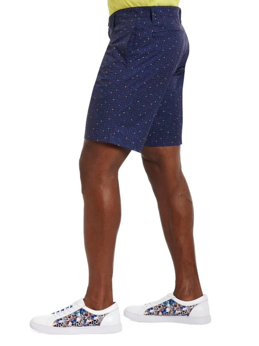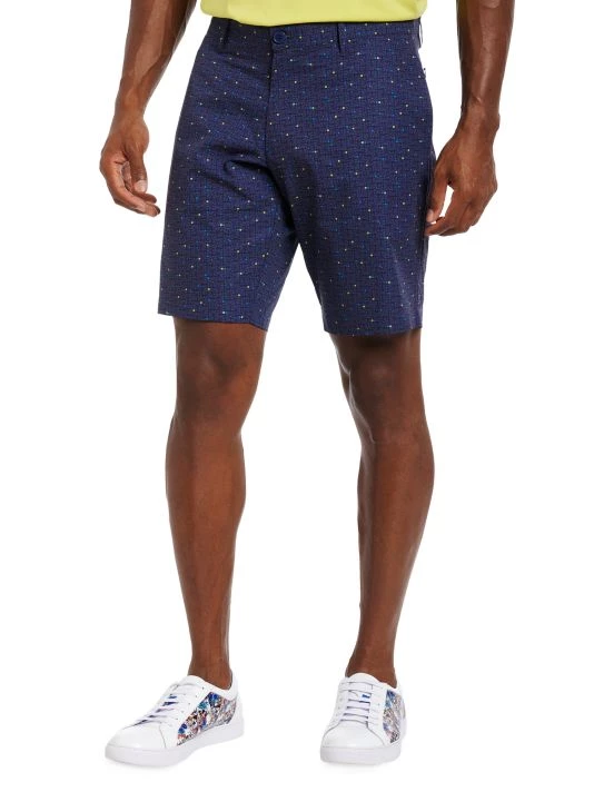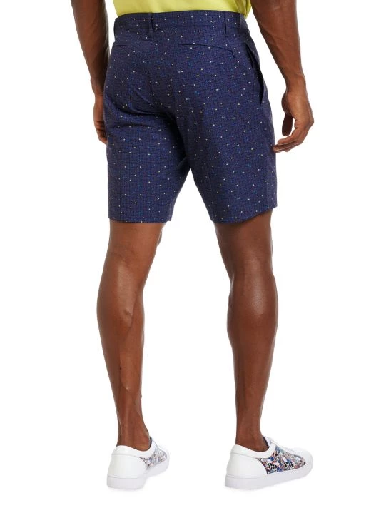 In a deco golf print, these shorts feature side slip pockets and back zip pockets.