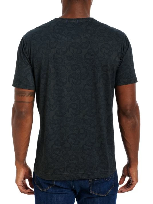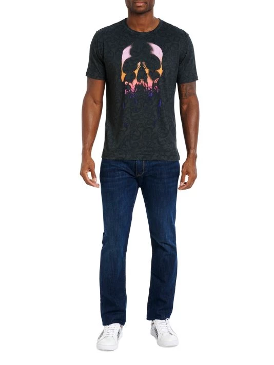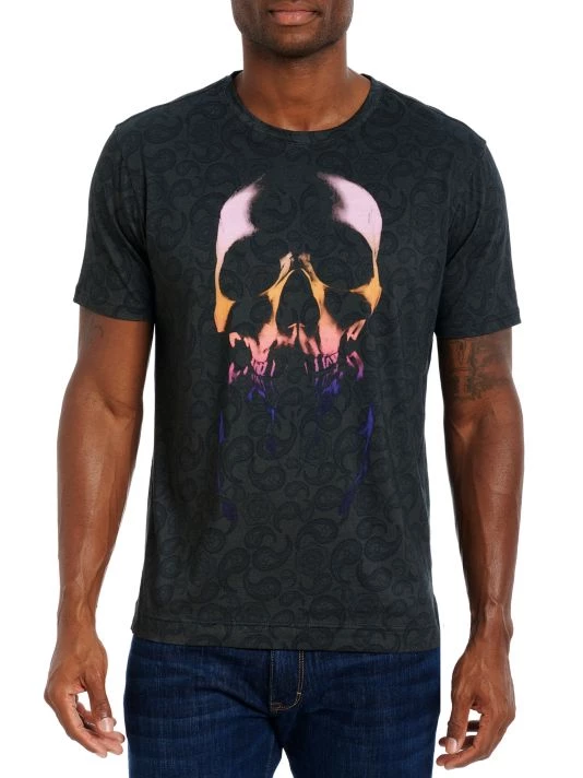 This cotton T-shirt is decorated with a paisley print with skull overlay.
