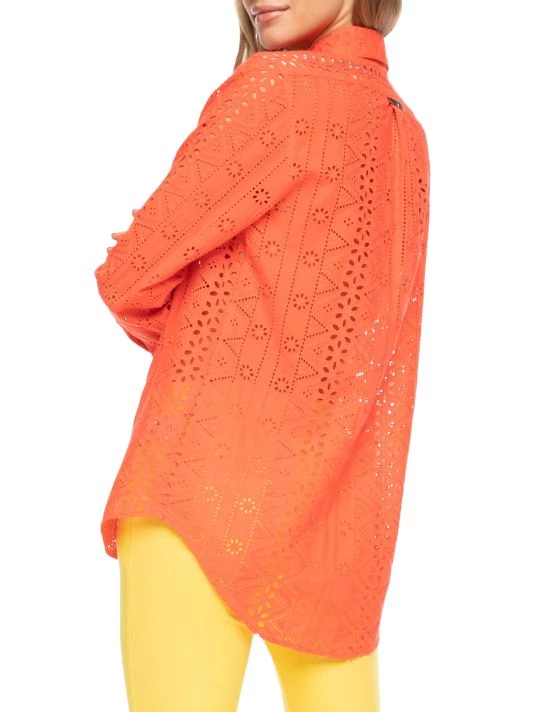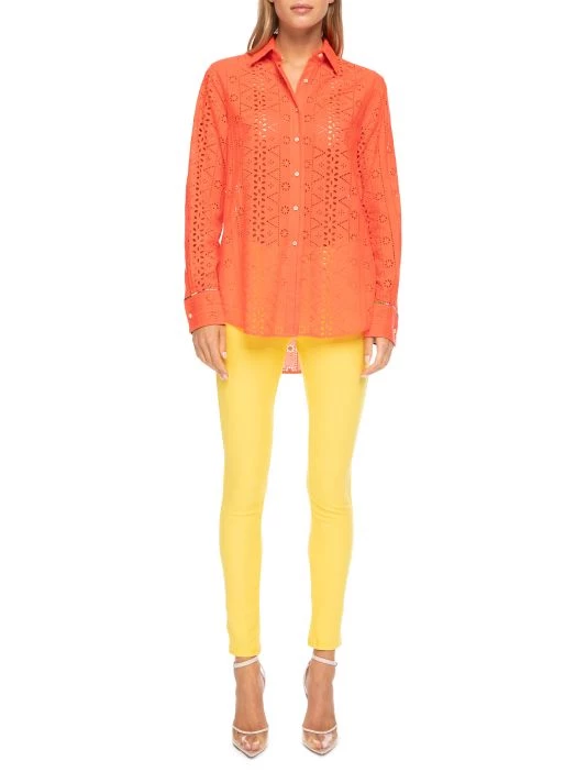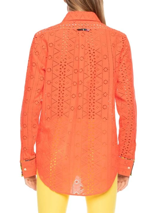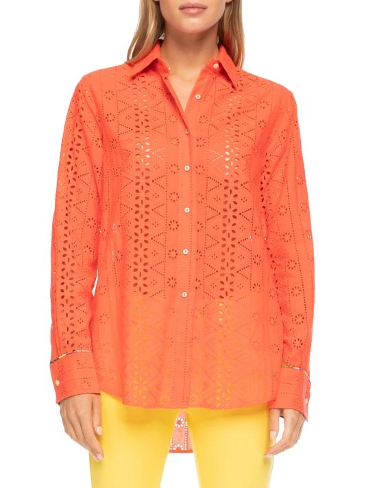 Eyelet patterning lends dimension to this delicate cotton button-up shirt.