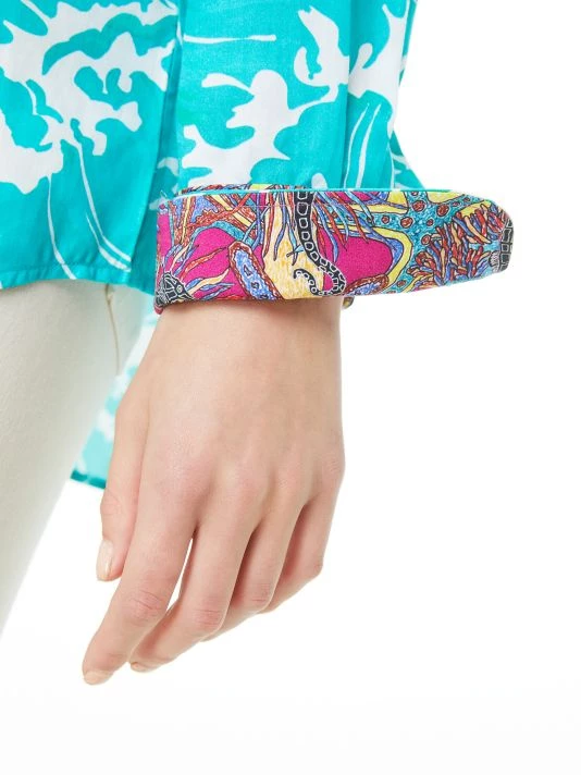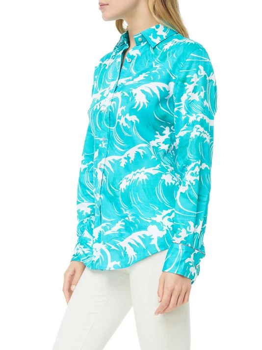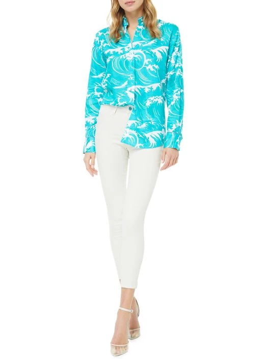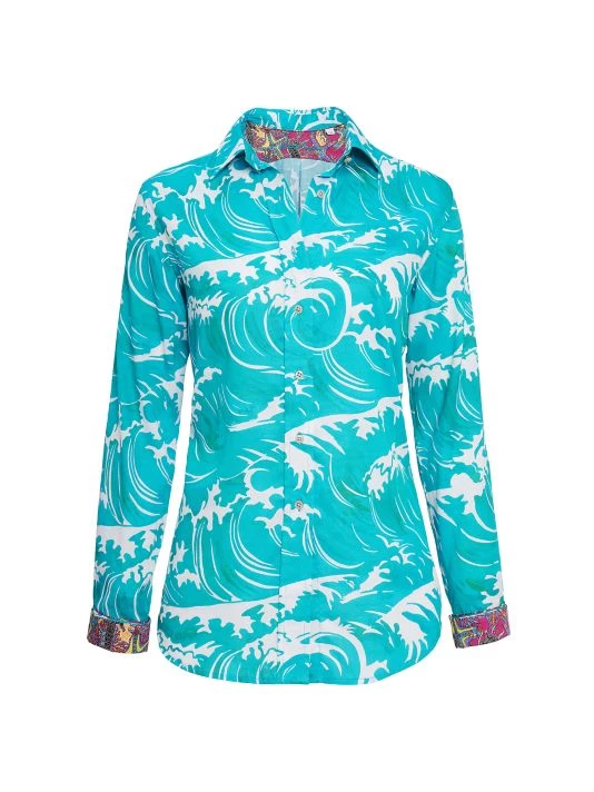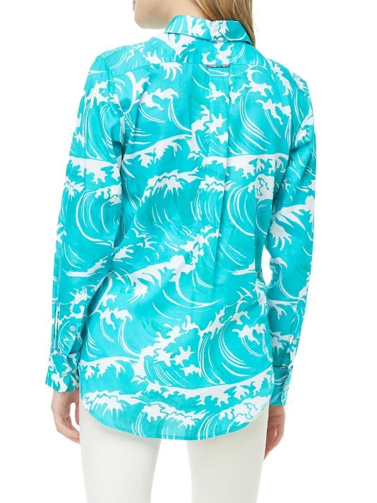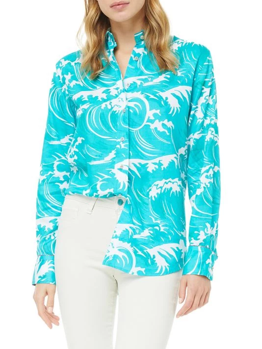 Crated of cotton, this version of the Carrie shirt by Robert Graham features a retro-inspired wave print and contrast color sleeve cuffs.