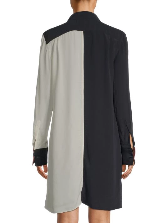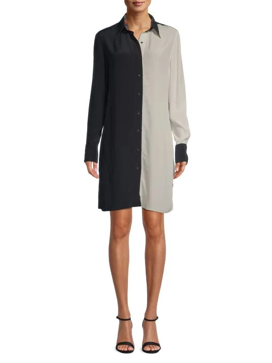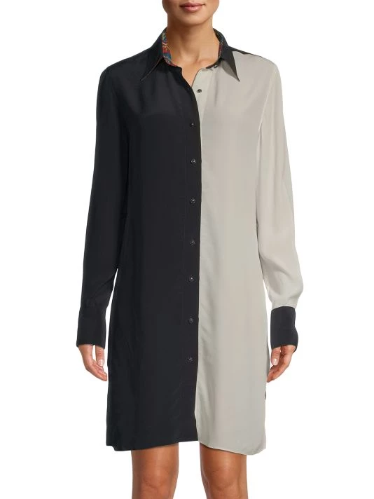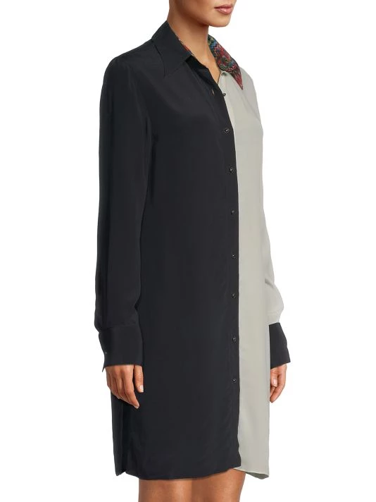 From the Robert Graham Collection. Relaxed shirtdress with a split two-tone design, features a spread collar and rounded hem.
