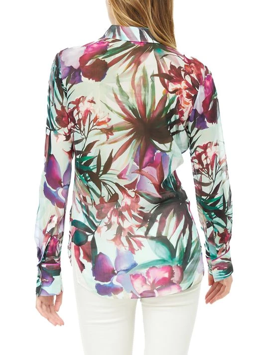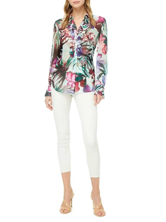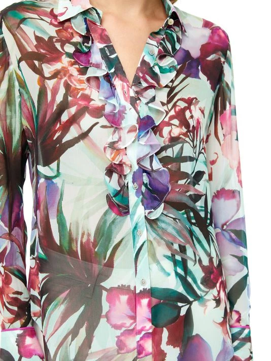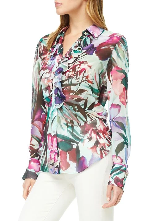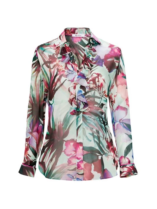 This tropical floral print blouse is finished with a delicate ruffle detail along the neckline.