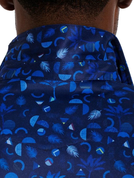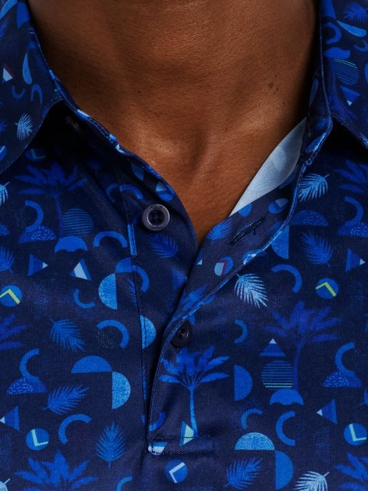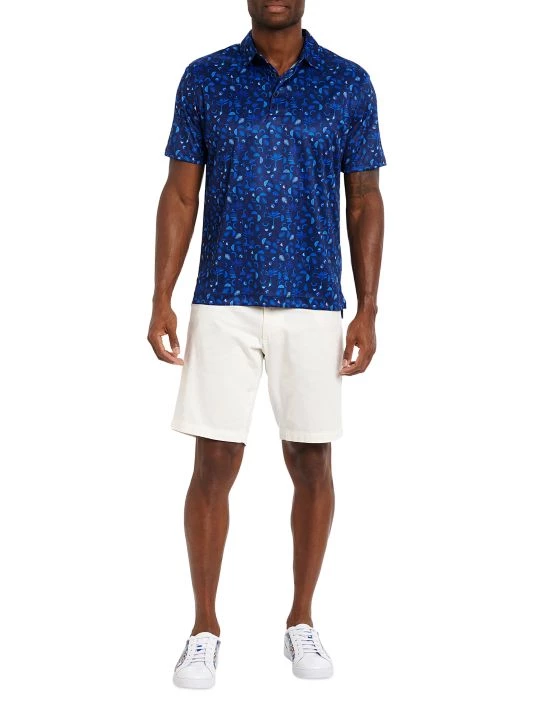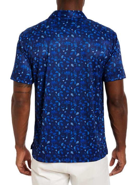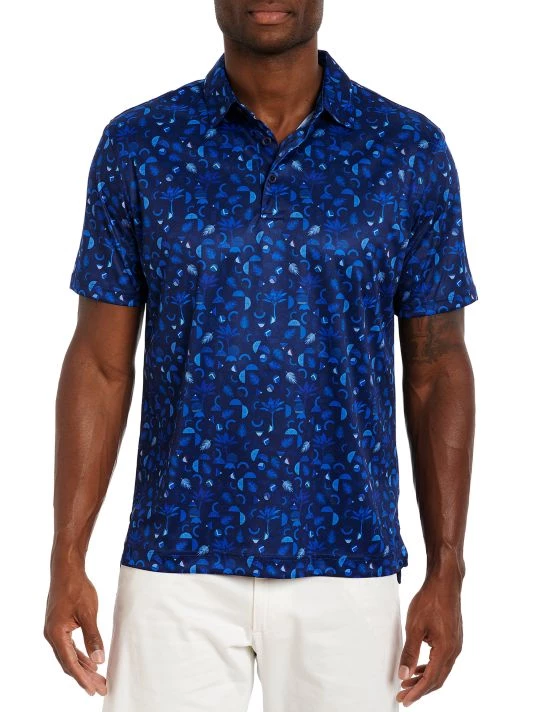 An abstract botanical and geometric print decorates Robert Graham’s knit polo shirt.