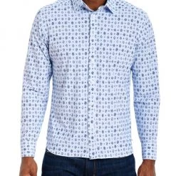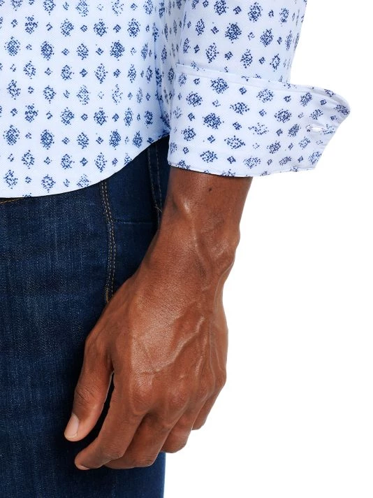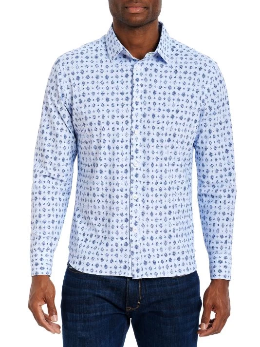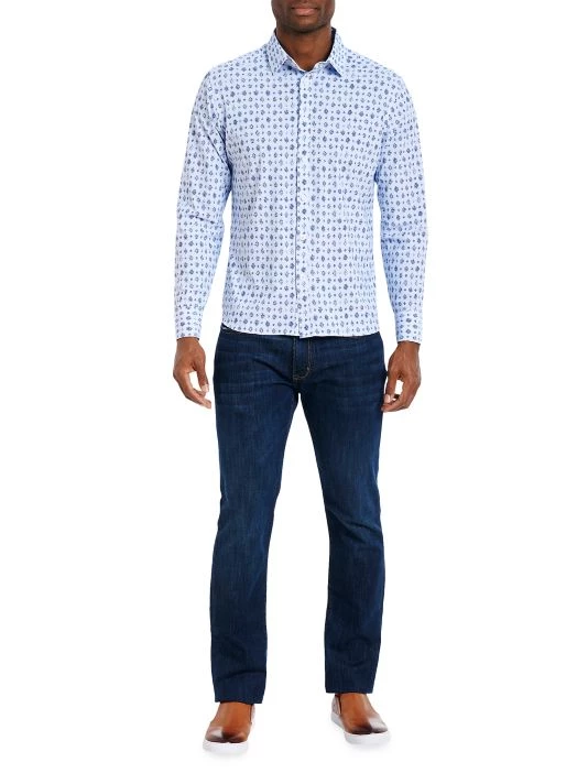 From the Robert Graham Collection. A performance woven knit long-sleeved shirt is adorned with a speckled-inspired motif.