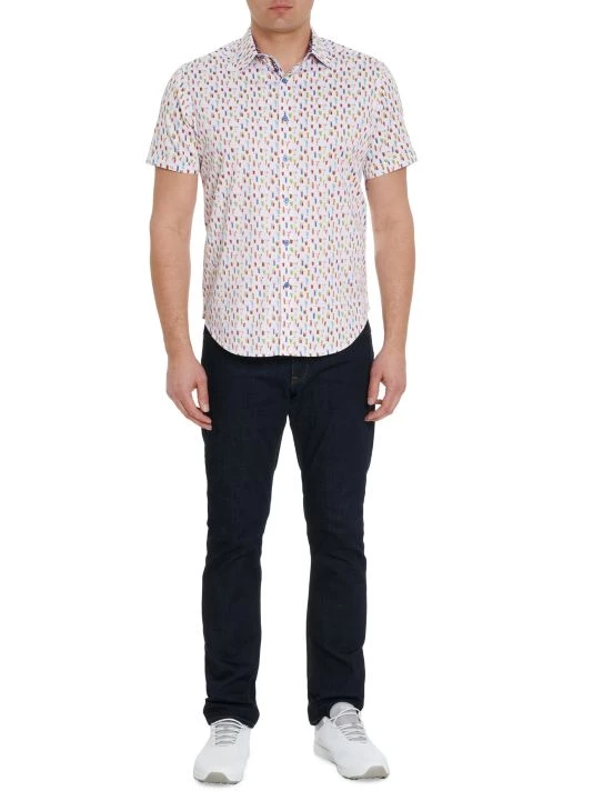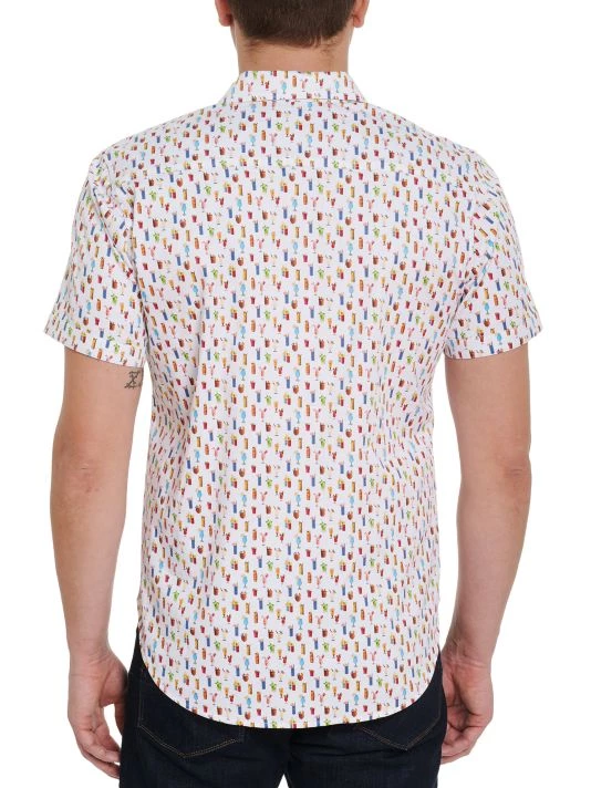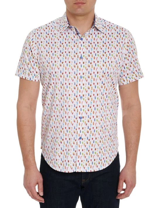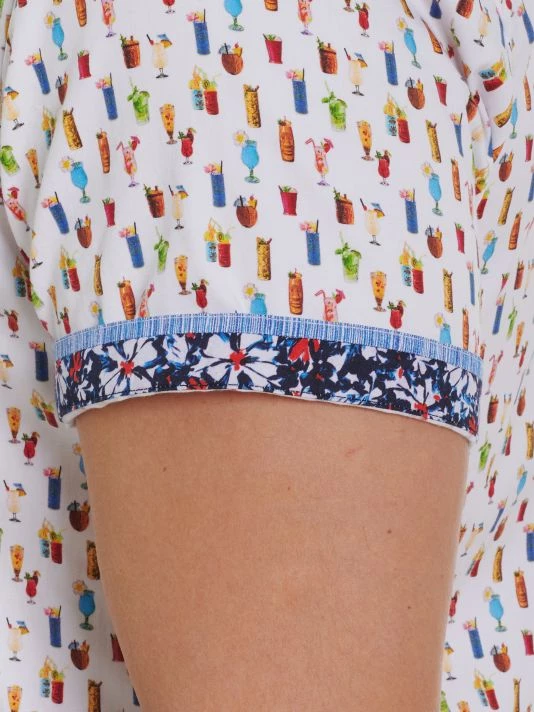 This Coral Brews woven shirt from Robert Graham is embellished with a tropical cocktail beverage pattern and hidden contrast print on the sleeve hem and placket.