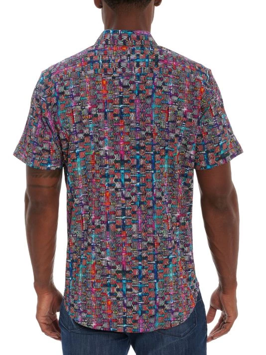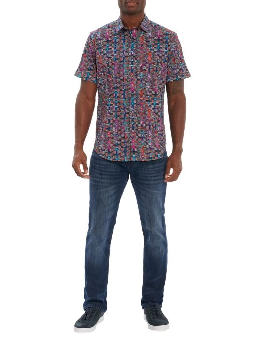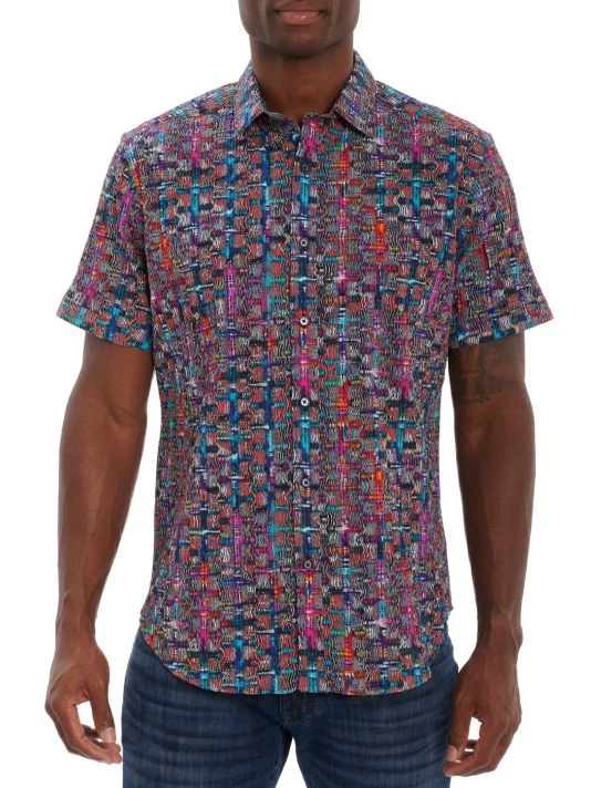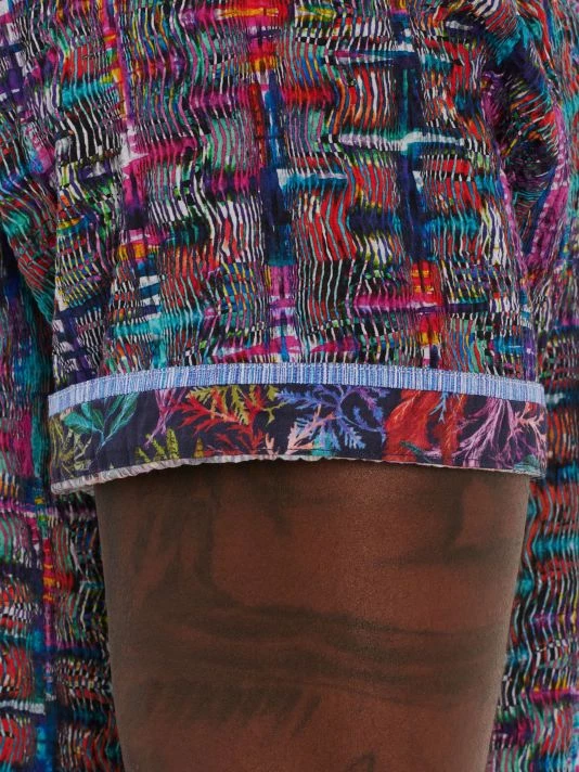 This Crewcut woven shirt with a crinkle textures boasts a digital signal glich pattern.