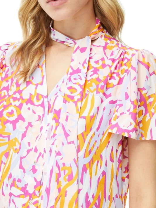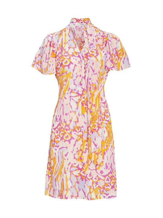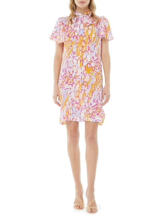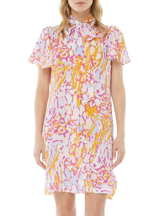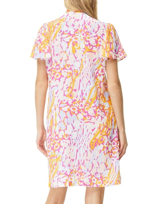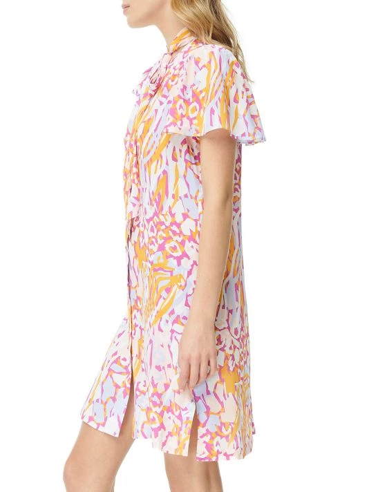 The Daphne shirtdress is made of flowy fabric with flutter sleeves and a tie-neck.