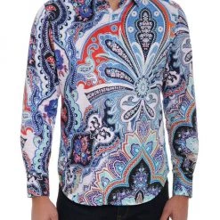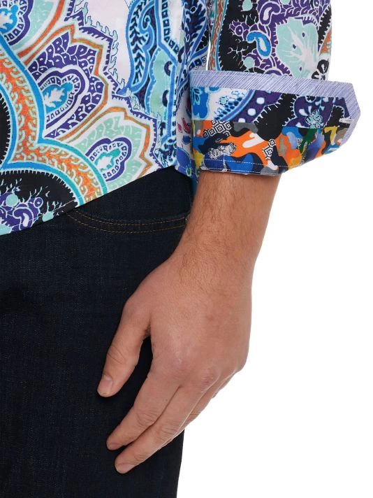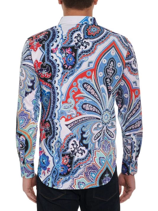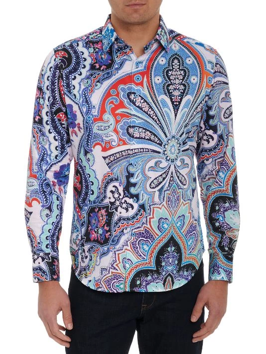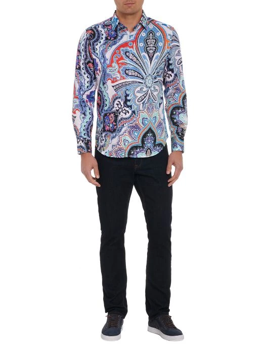 A bold paisley print defines this Devil’s Treasure long-sleeve shirt from Robert Graham.