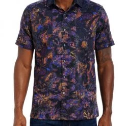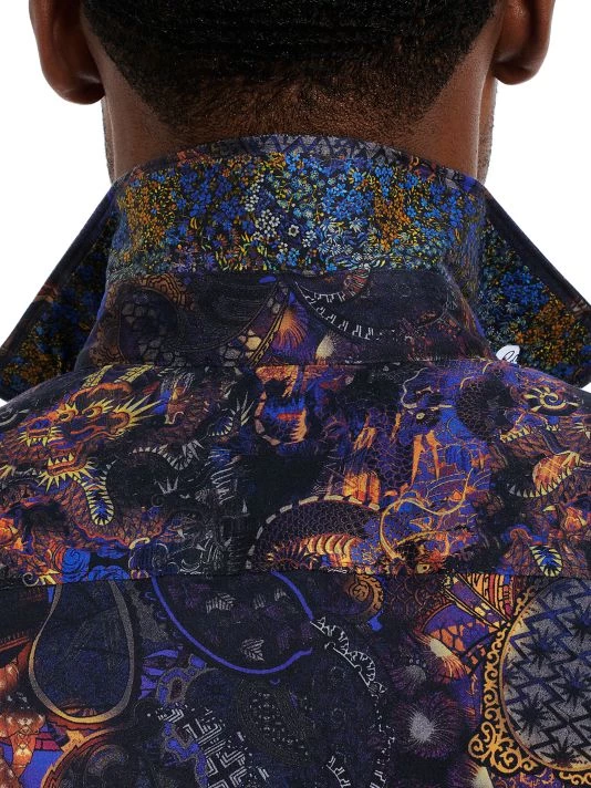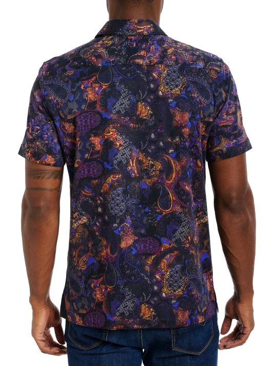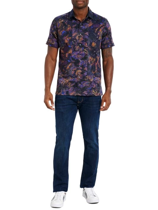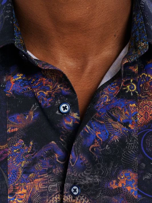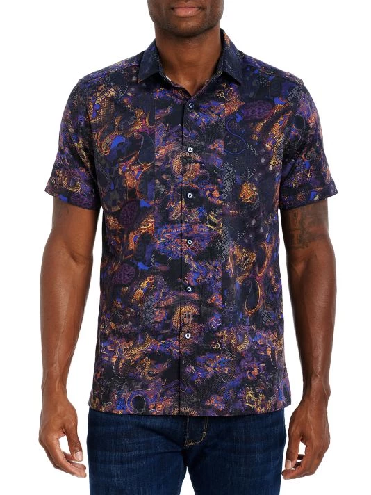 A unique dragon print adorns this cotton-blend short-sleeve shirt.