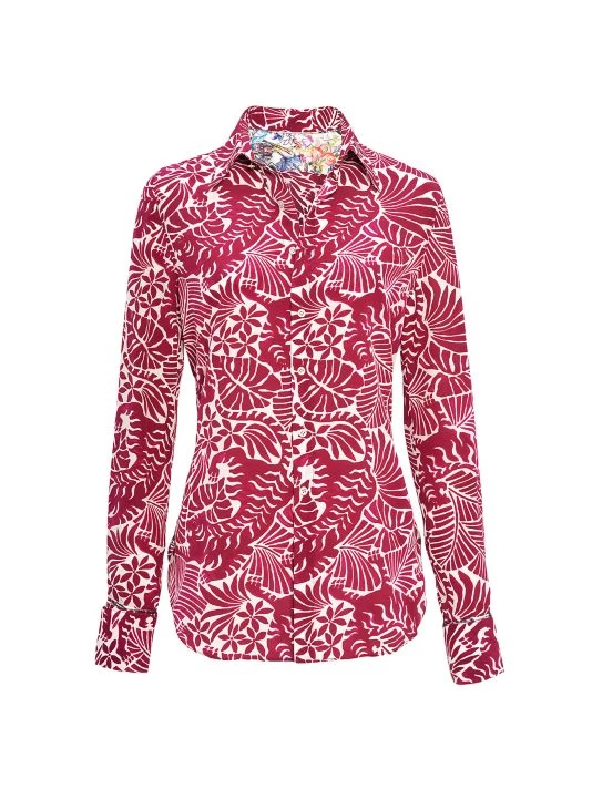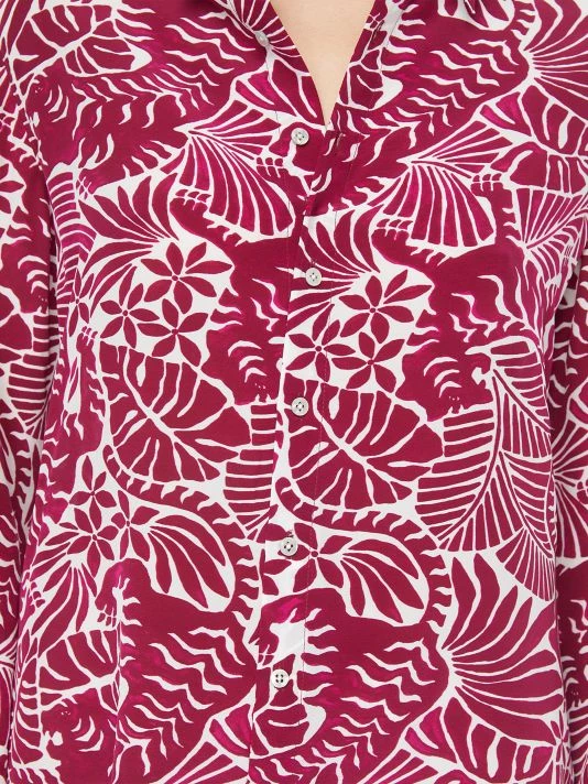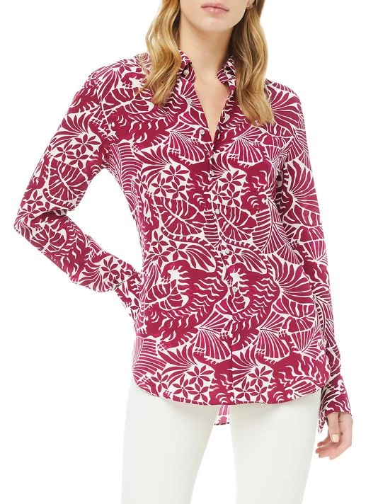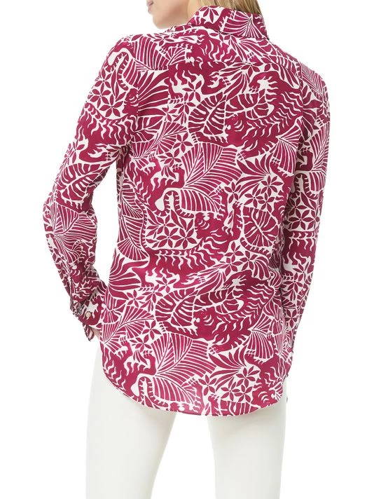 The Gabriela shirt by Robert Graham features a blownout palm print with motifs of crouching tigers.