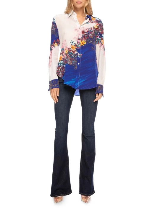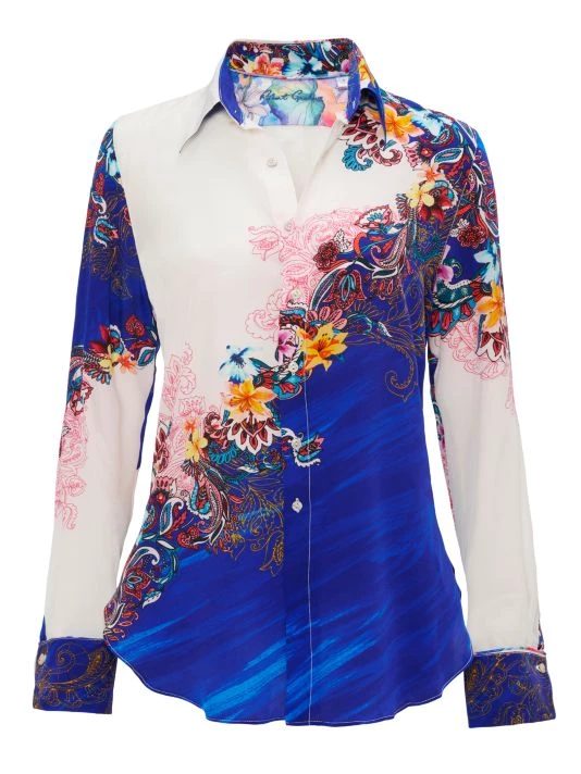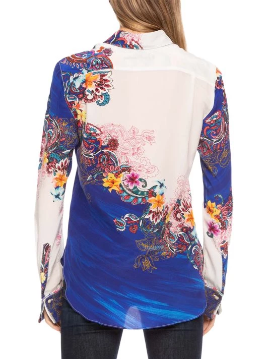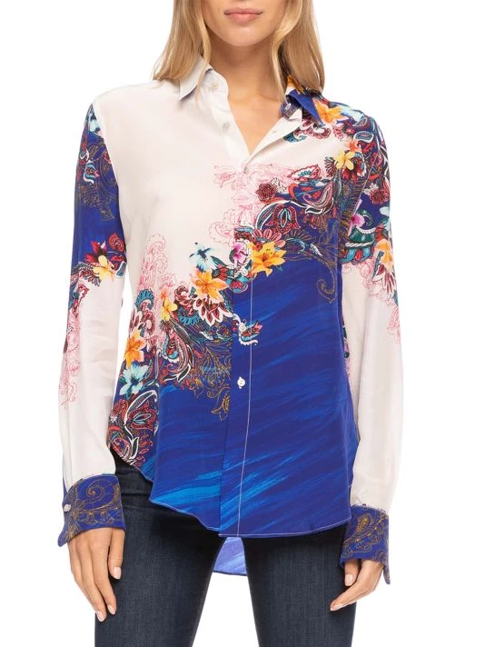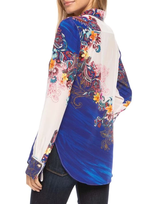 Brilliant paisley florals cover this two-tone silk crepe de chine button-up shirt.