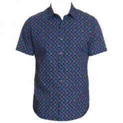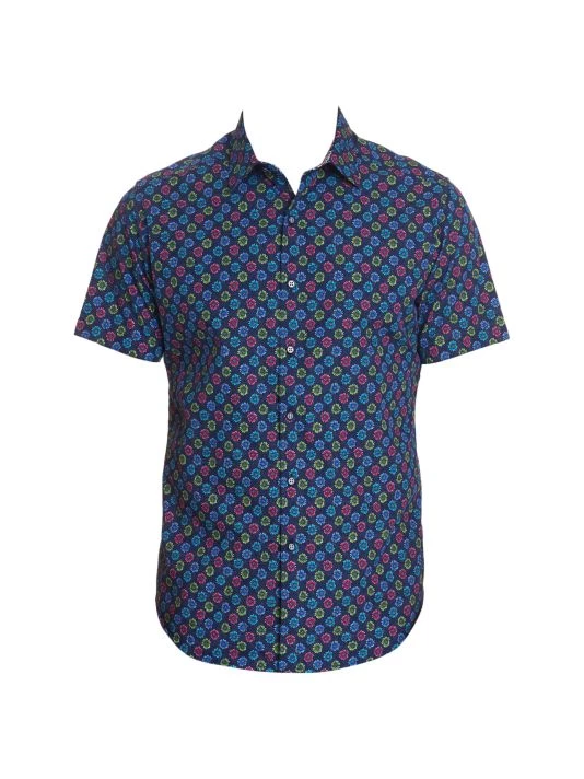 Multicolor floral print enlivens this crisp cotton shirt with short sleeves and button front.