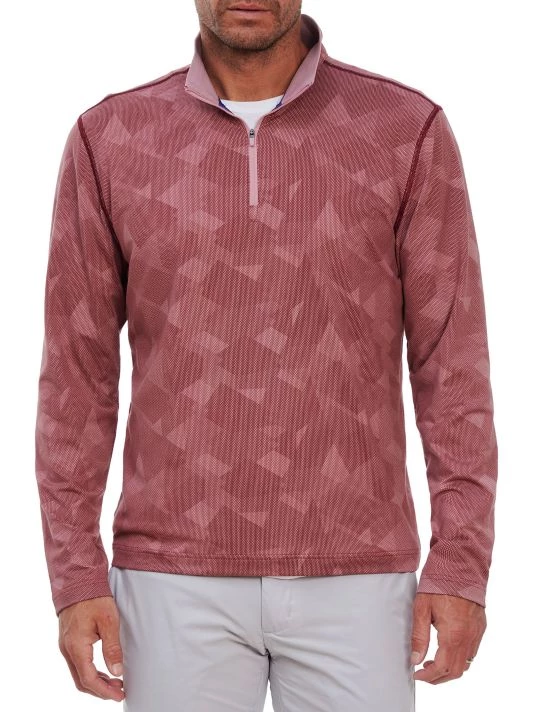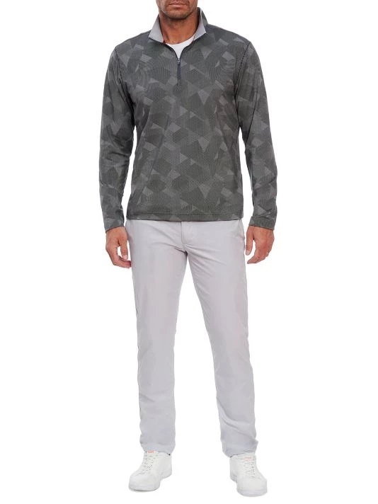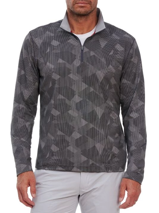 An allover gemetric print stands out on this quarter-zip sweatshirt.