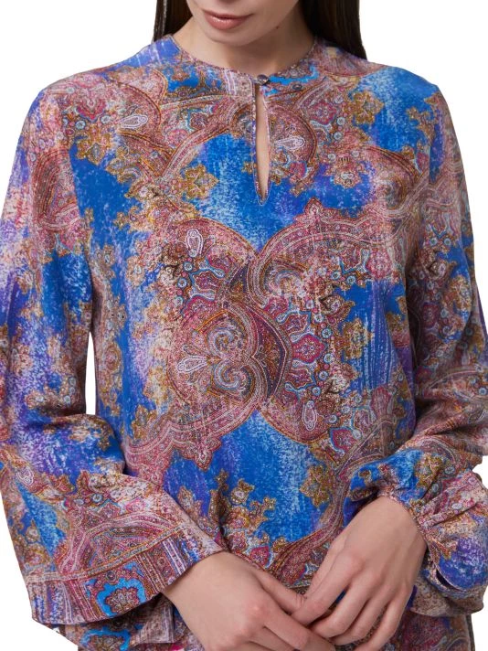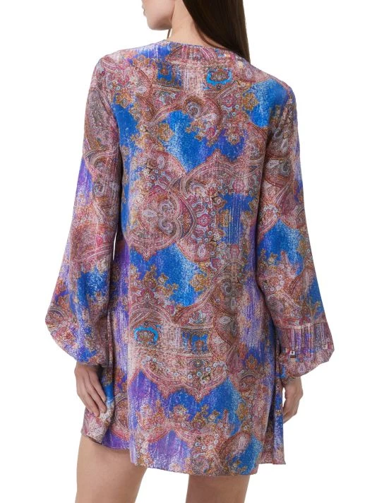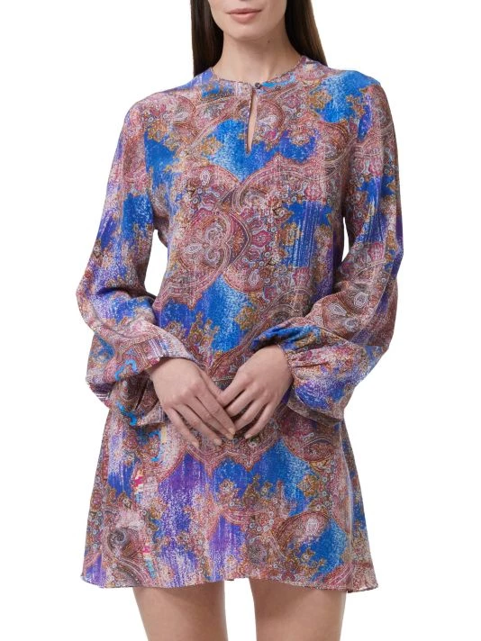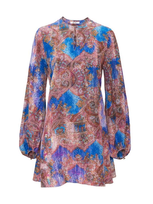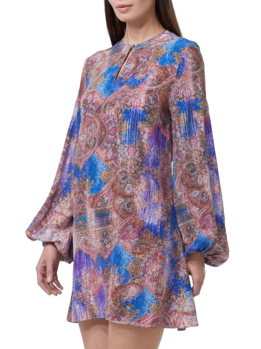 The Giselle dress from Robert Graham features a shift silhouette in a bold baroque paisley print. Flowing blouson sleeves and a keyhole neckline complete the look.