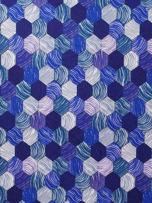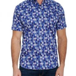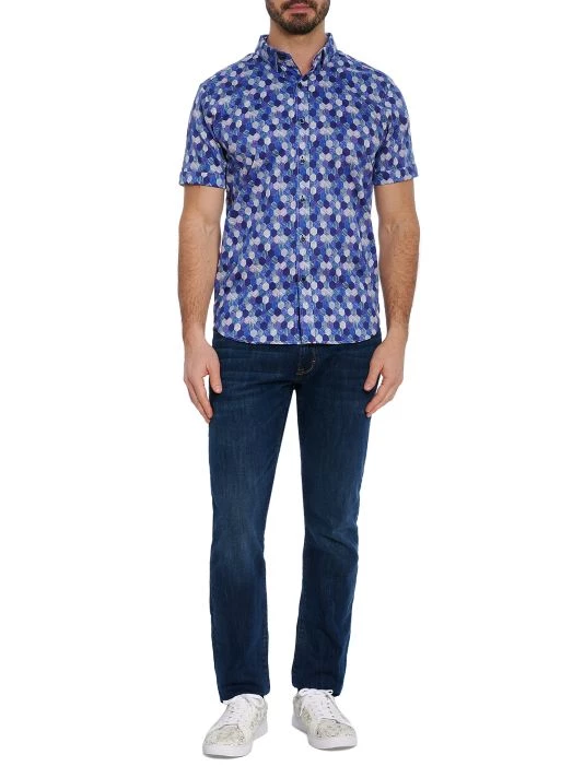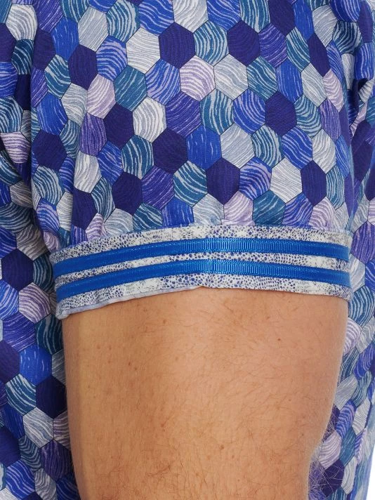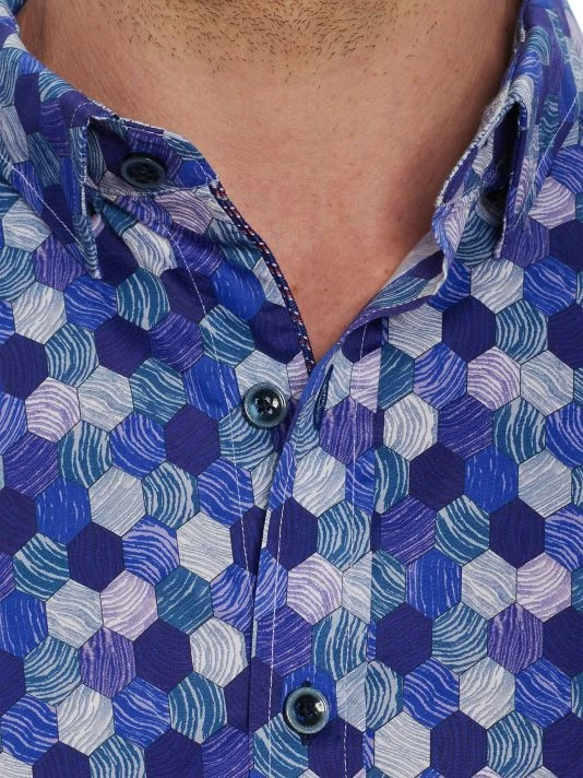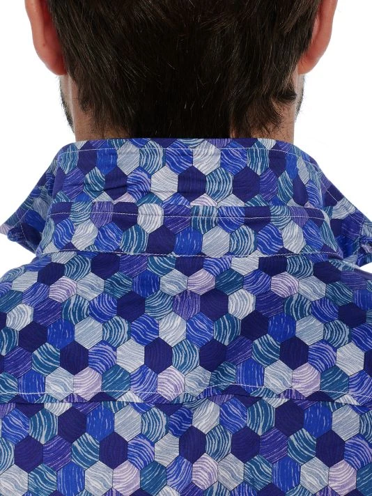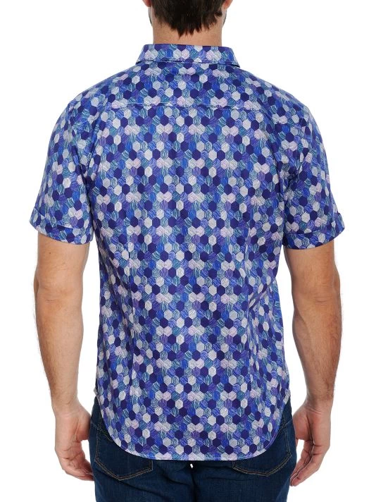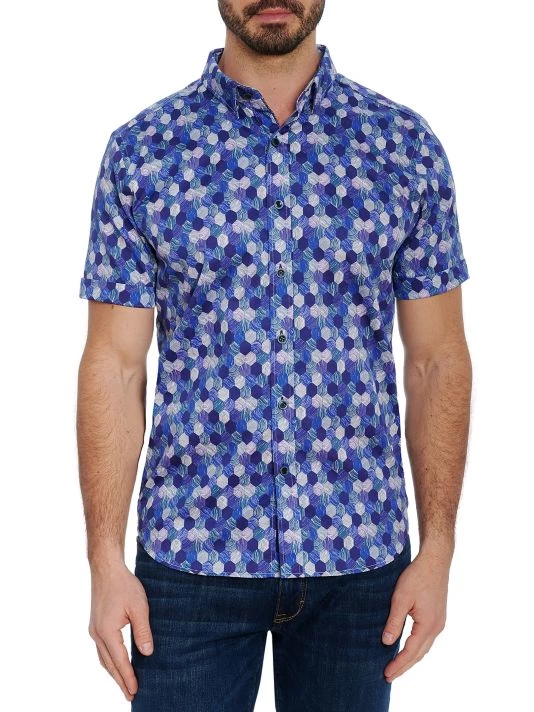 An allover hexagon print decorates this short-sleeve satin shirt.