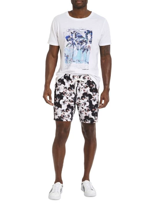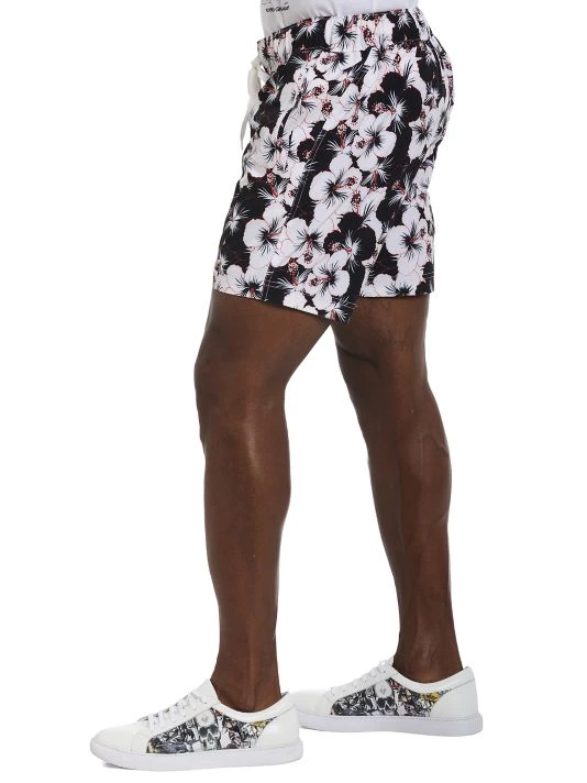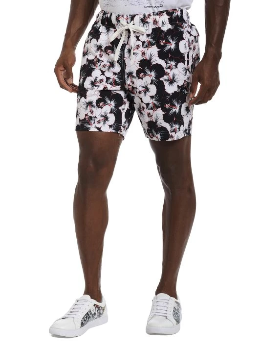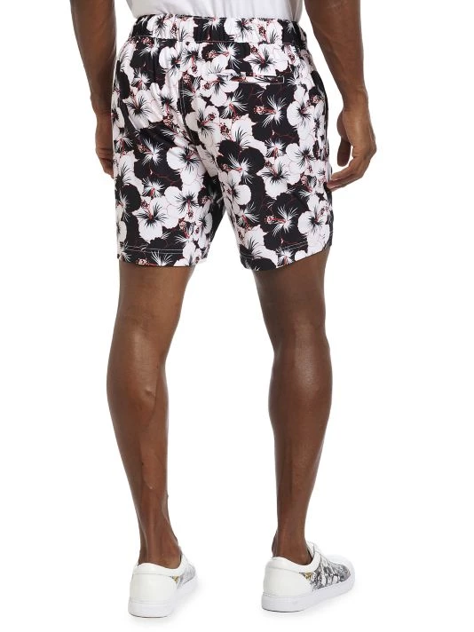 These swim shorts feature a hibiscus print and a drawstring elastic waistband.