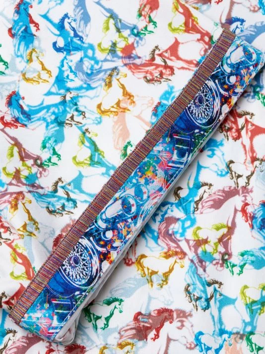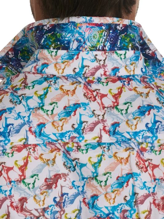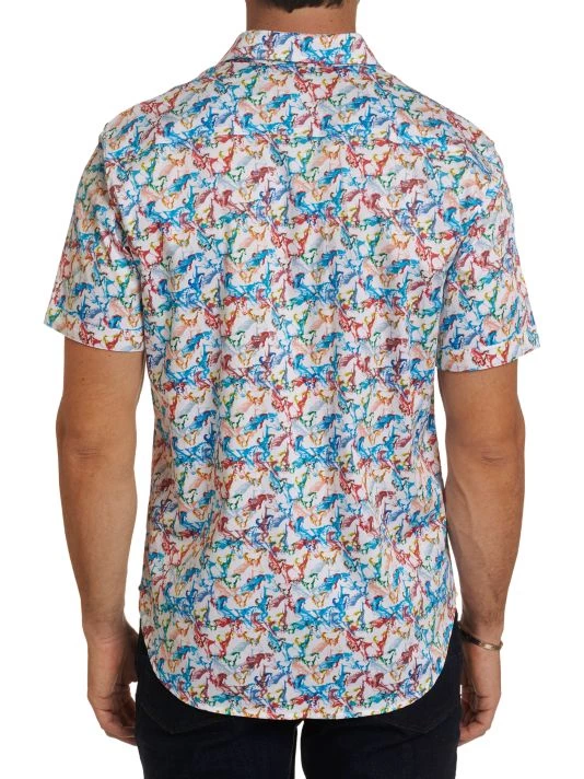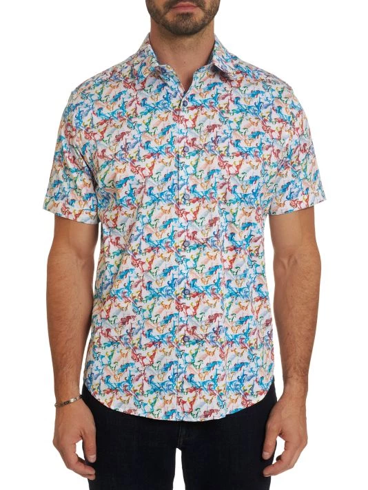 A colorful horse print is featured on this short-sleeve shirt woven from cotton.
