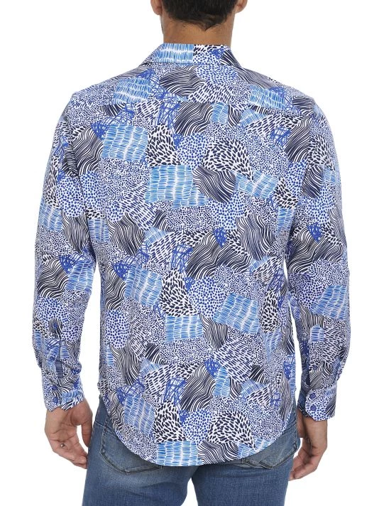 Vibrant mixed prints cover this slim-fit stretch button-up shirt.