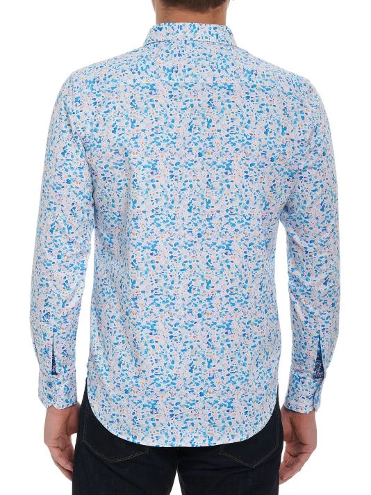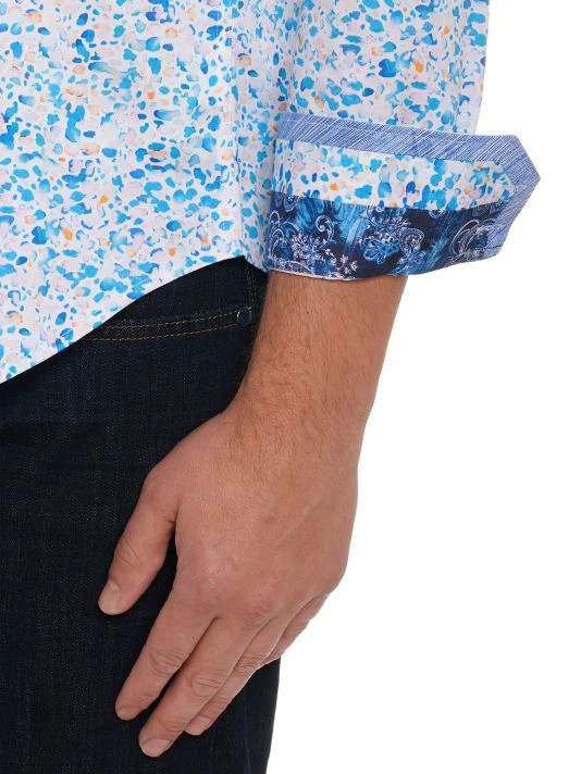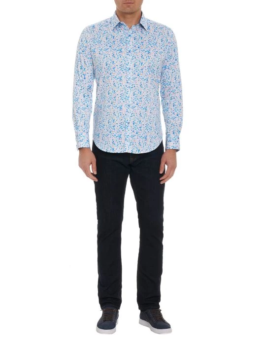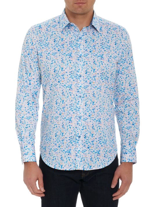 Crafted of a cotton blend, this button-front shirt by Robert Graham is adorned with a jellyfish-inspired motif. A contrasting print is featured on the reverse of the spread collar and barrel cuffs.