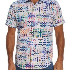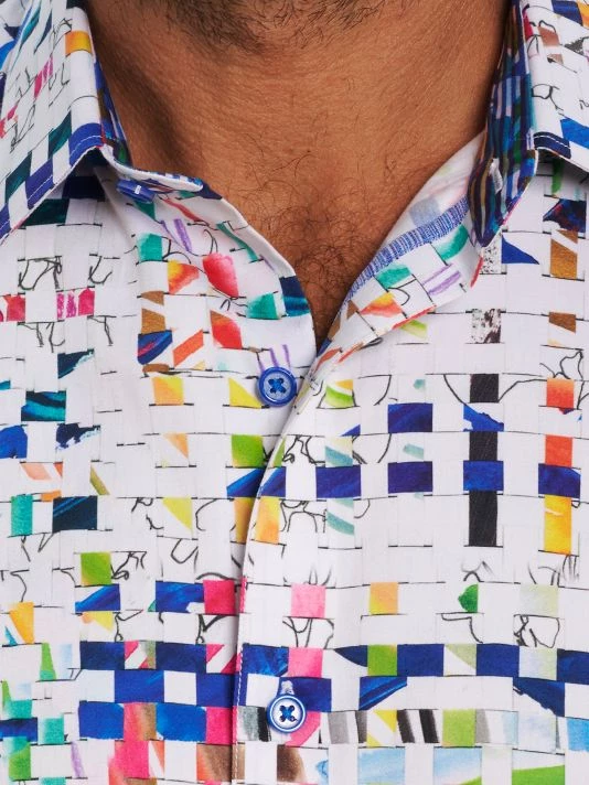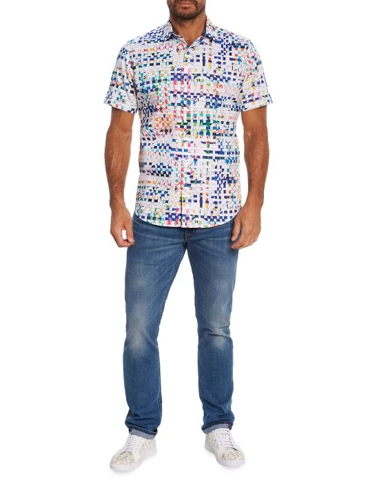 A colorful basketweave motif defines this cotton short-sleeve sport shirt from Robert Graham.