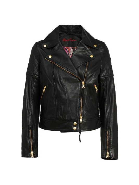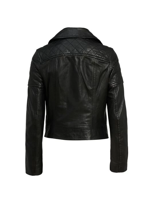 Edgy moto jacket crafted of a subtle Nappa leather features notch lapels and diamond-quilted yoke.