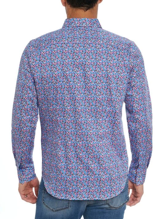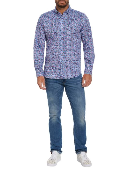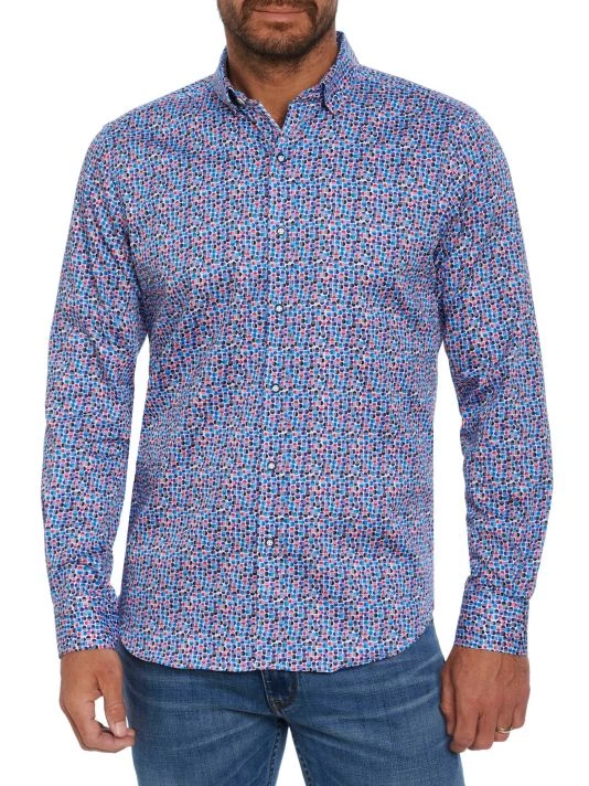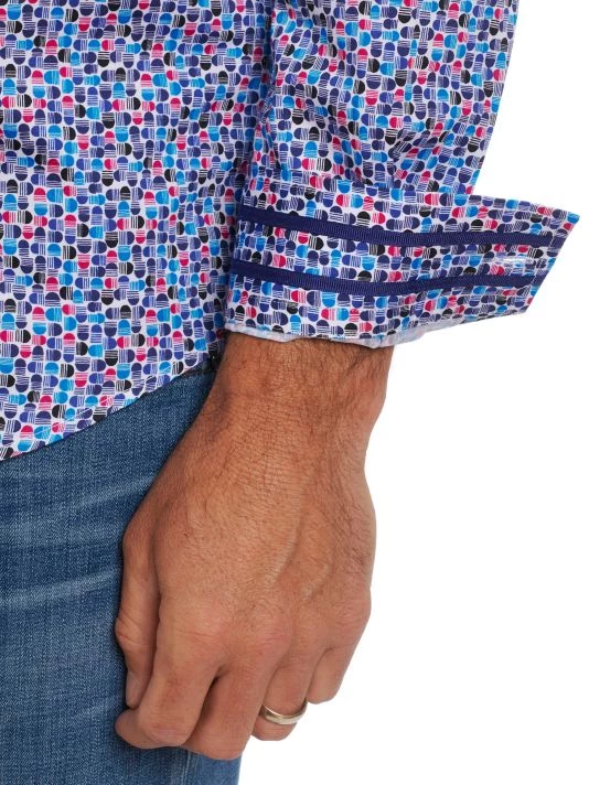 The North Haven button-front shirt by Robert Graham is adorned with a colorful geometric pattern.