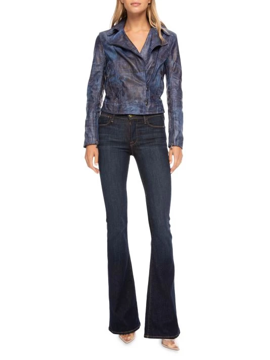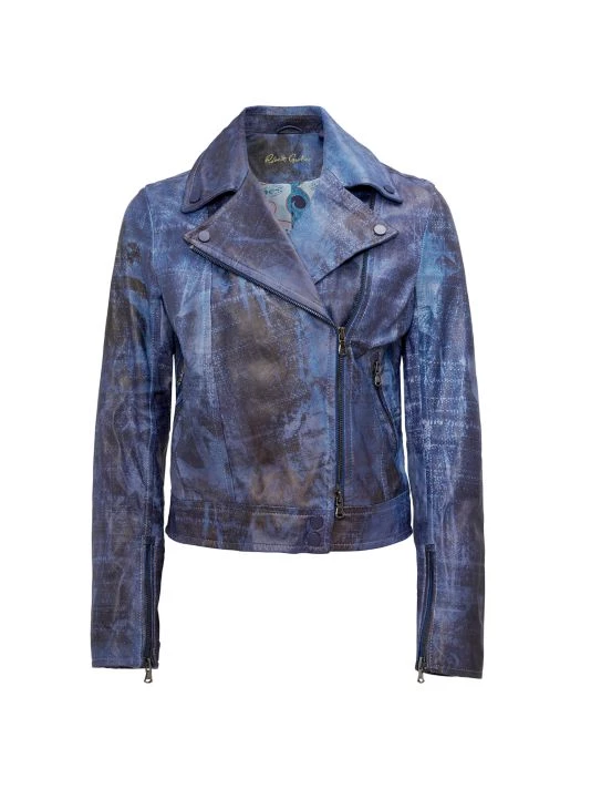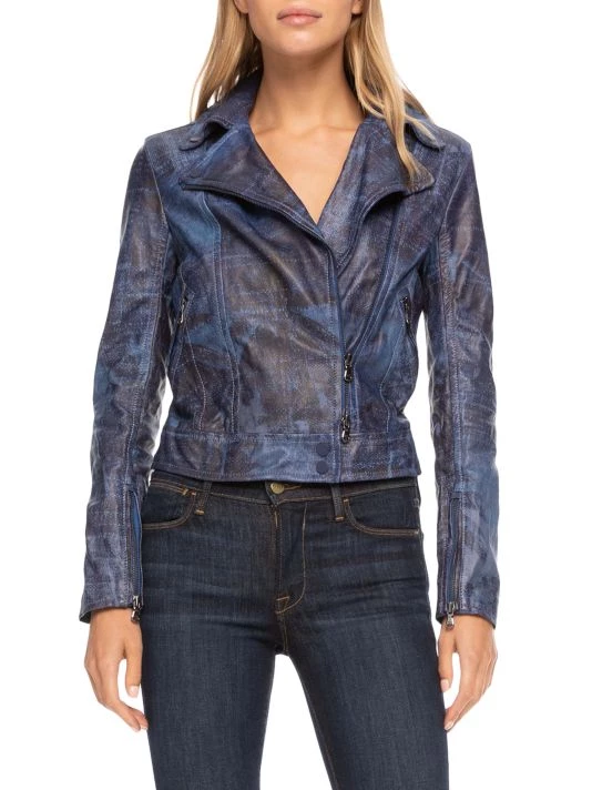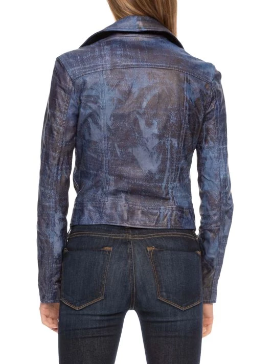 Designed with an abstract finish, this leather biker jacket has a streamlined silhouette.