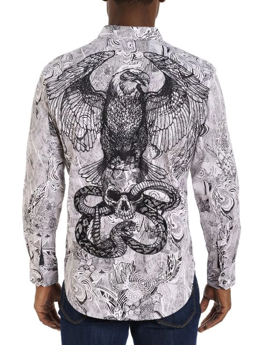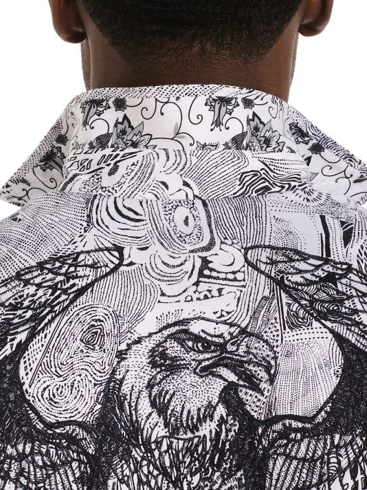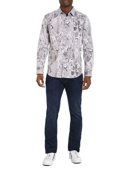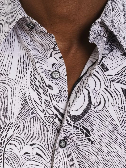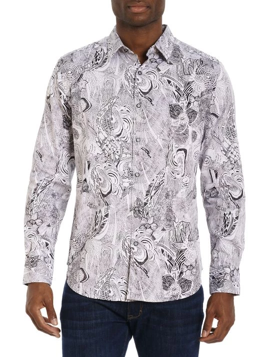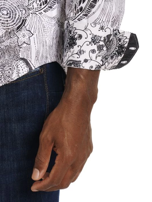 This Robert Graham shirt is crafted of a stretch cotton blend. Embroidered with a monochrome floral printed design, this shirt is styled with a spread collar and shirttail hem.
