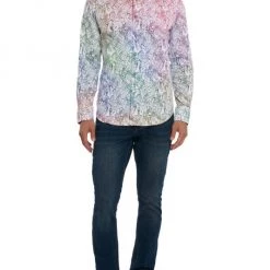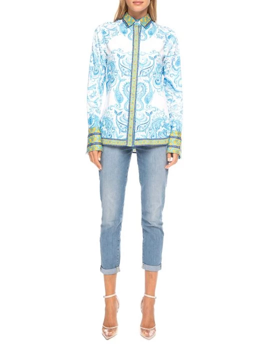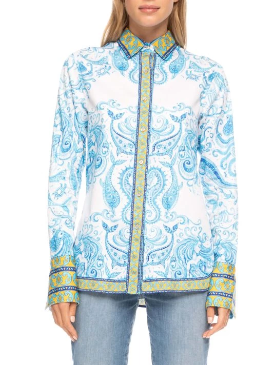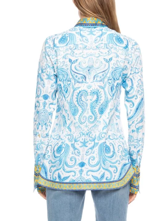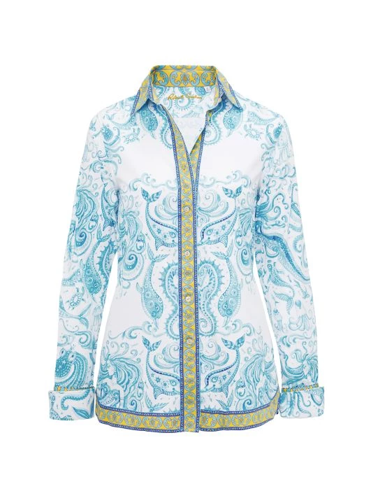 Designed with a whimsical mermaid print, this stretch cotton button-up shirt features an engineered border for dimension.