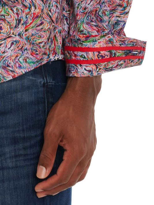 This slim-fit button-up shirt in a woven fabric flaunts a multicolor mosaic-inspired print.