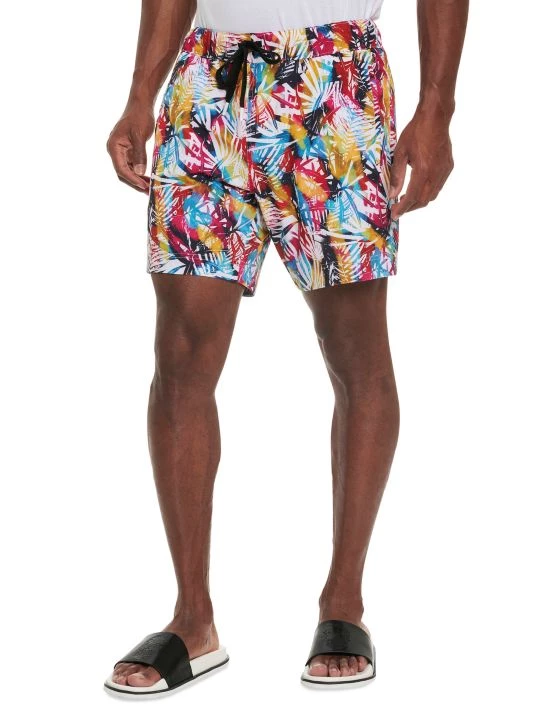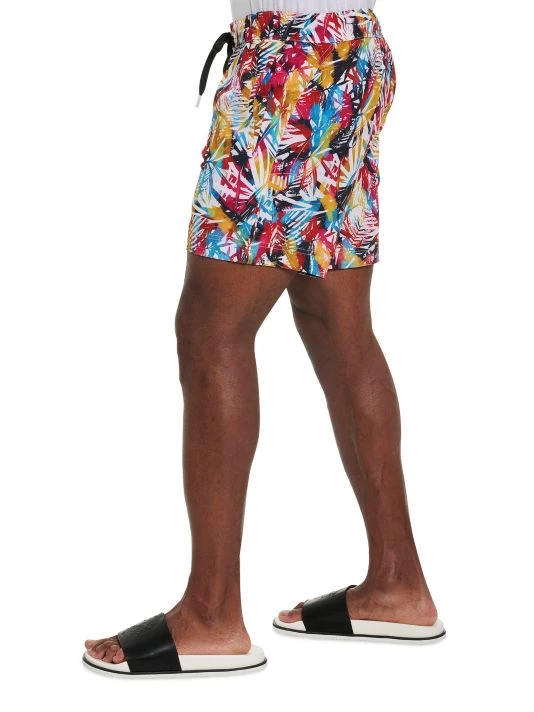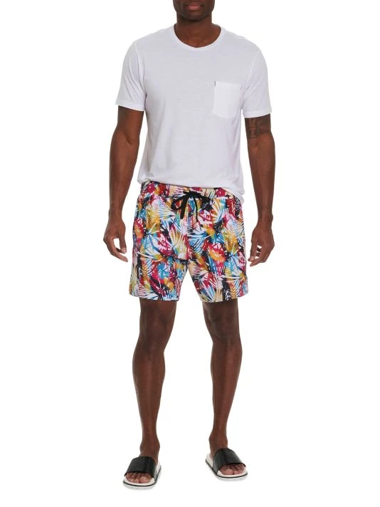 Featuring a comfortable elasticized drawstring waist, these swim shorts showcase a vibrant tropical print.