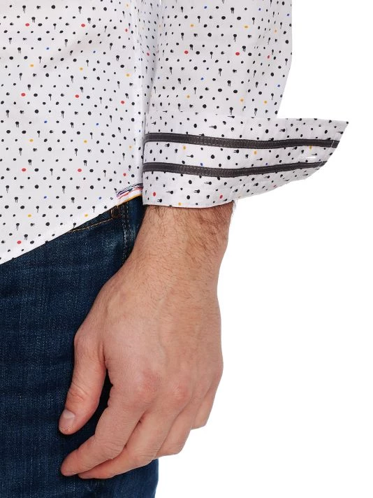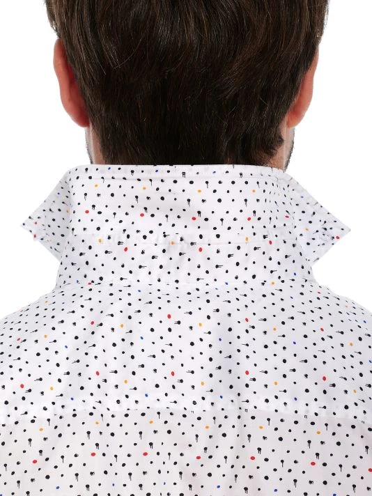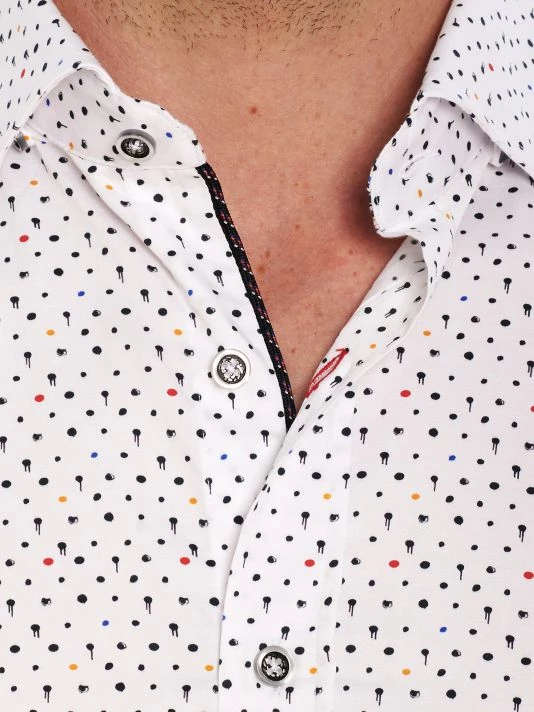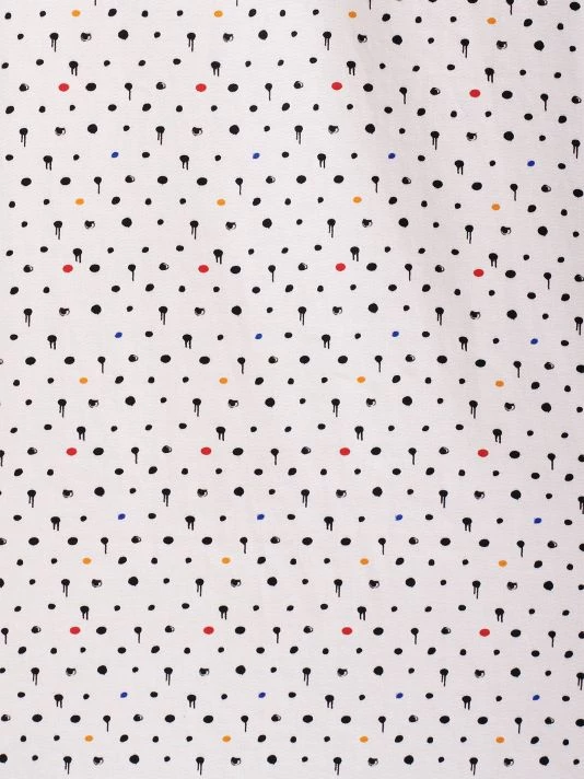 A multicolor dotted print adorns this satin button-up shirt.