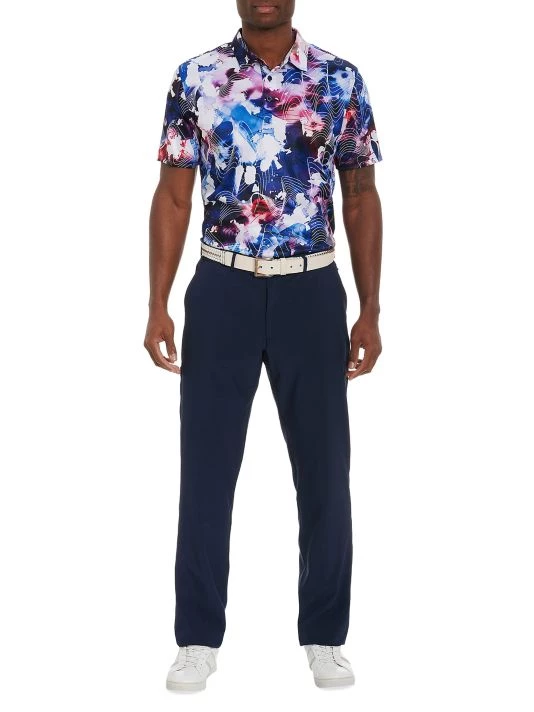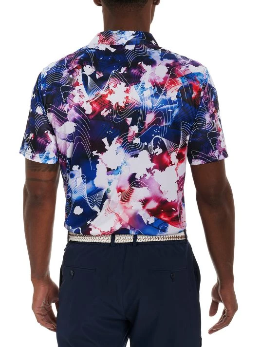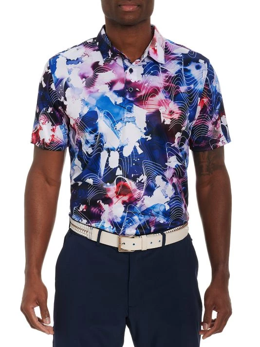 This Rip Tide knit polo from Robert Graham is cut in a short-sleeve fit and features an abstract print.