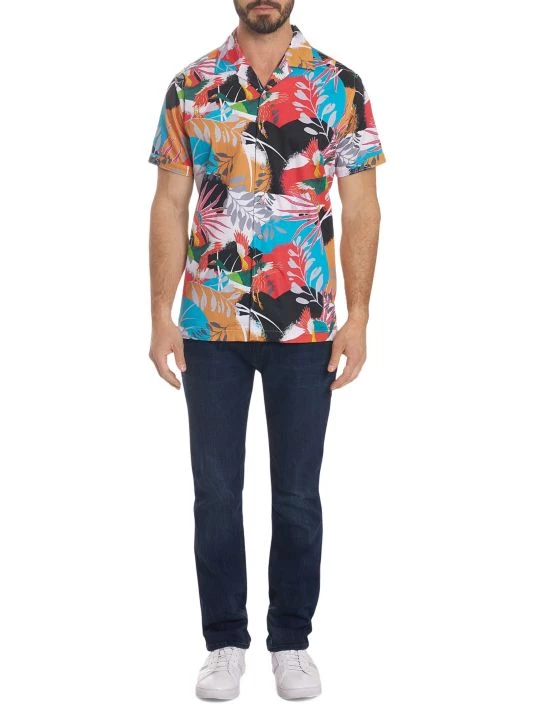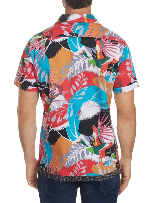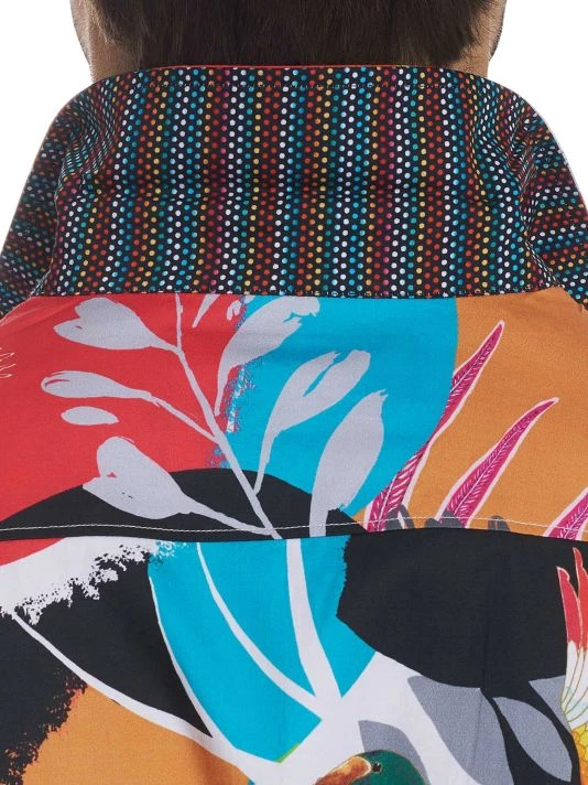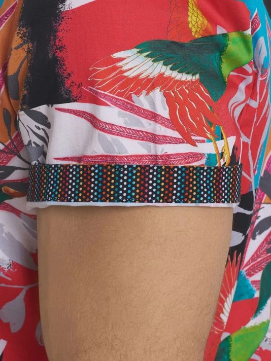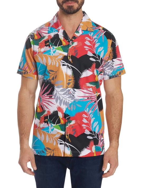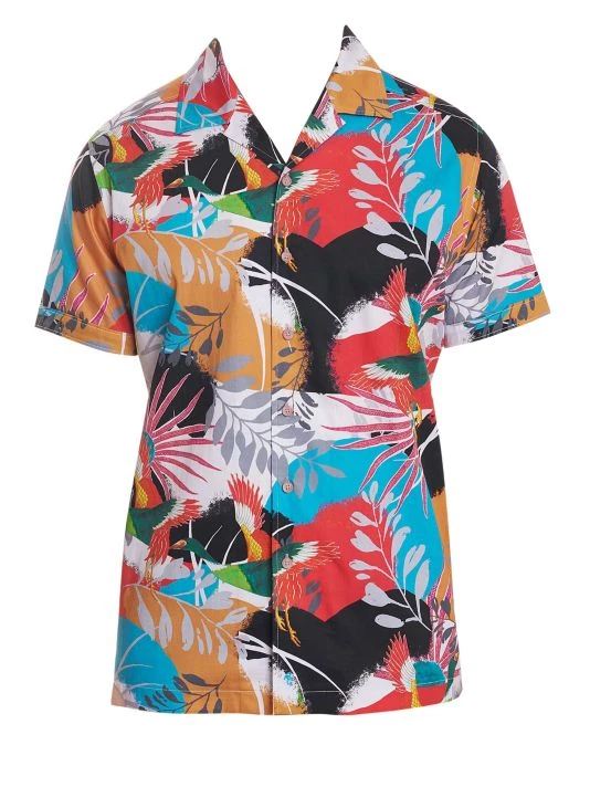 Lightweight cotton button-down shirt featuring a bold tropical floral print.
