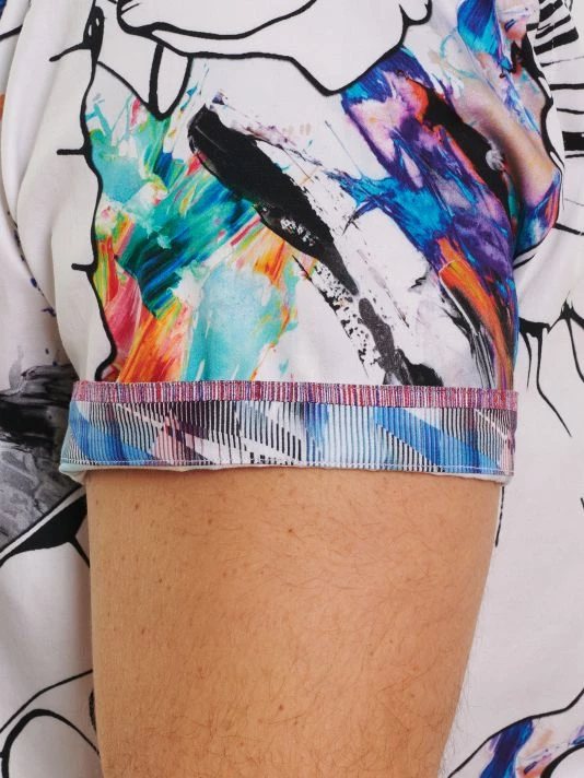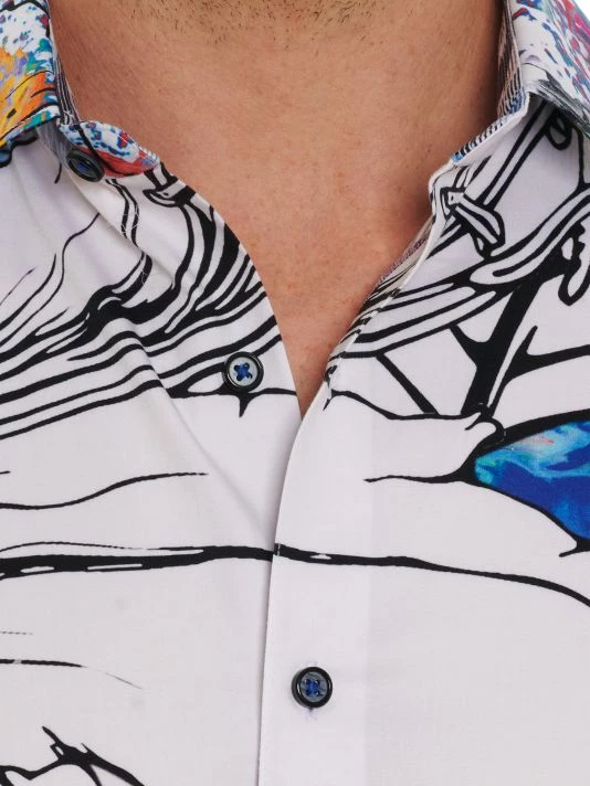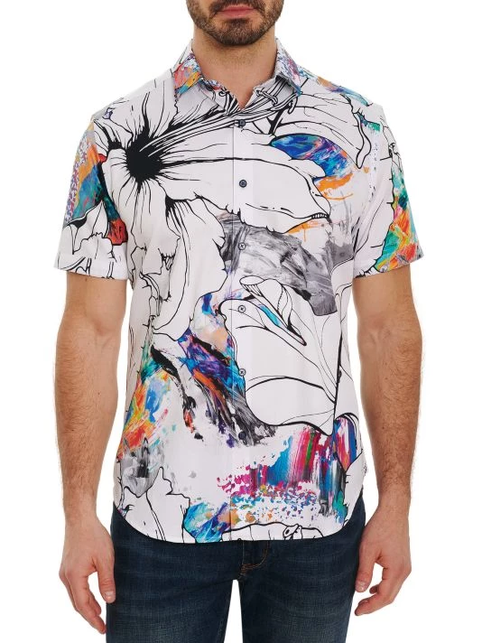 In a floral watercolor print, this cotton-blend shirt features a classic collar and short sleeves.