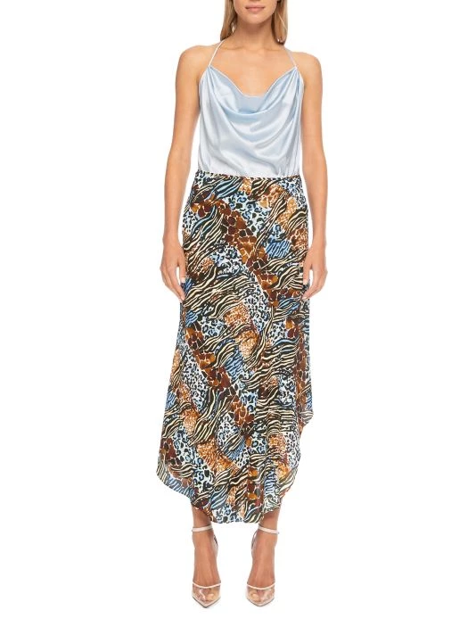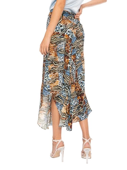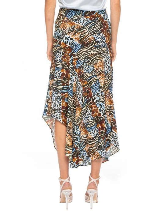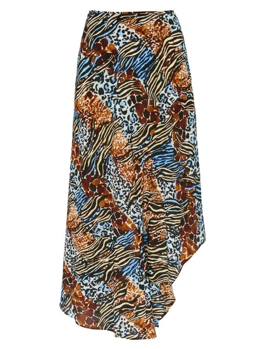This skirt is crafted from flowy animal printed fabric in a midi-length with an asymmetric hem.