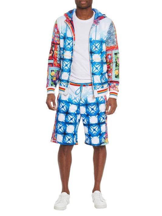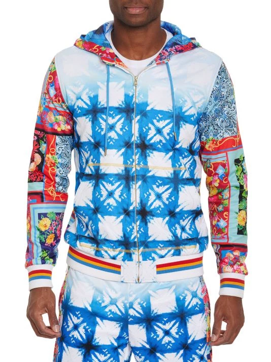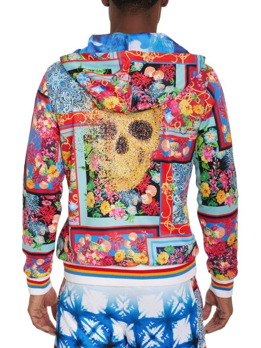 Luxurious and comfortable, this zip-up hoodie features a vibrant print and contrast striped trim.