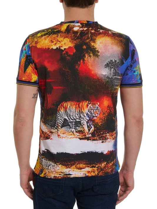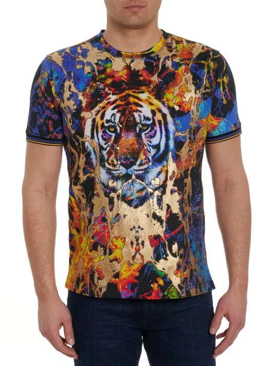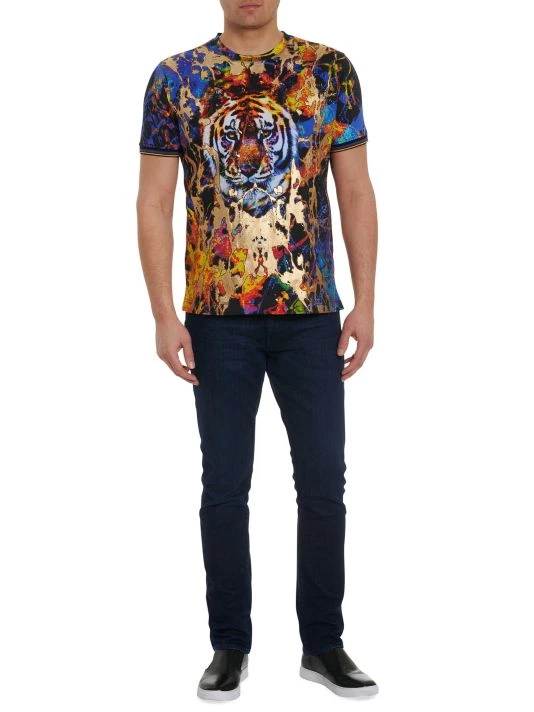 Robert Graham’s Sumatra Tiger Knit T-Shirt is adorned with an exciting tiger motif with splatter paint details.