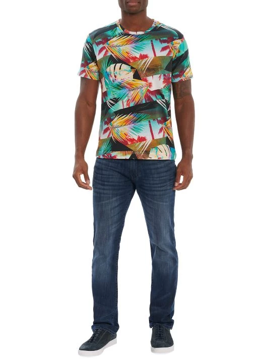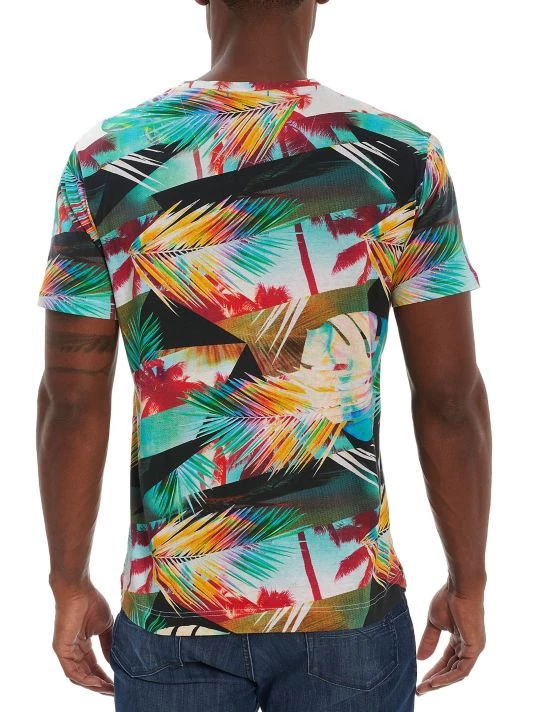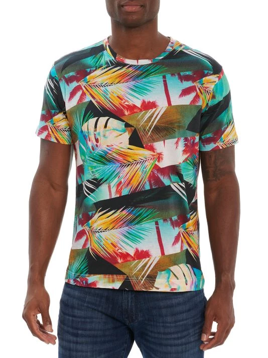 The Tenerife Knit T-shirt by Robert Graham is adorned with a collaged palm tree motif.
