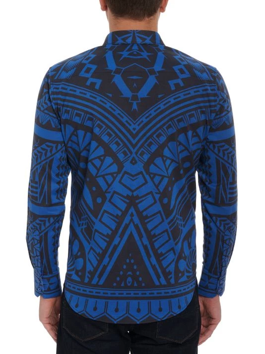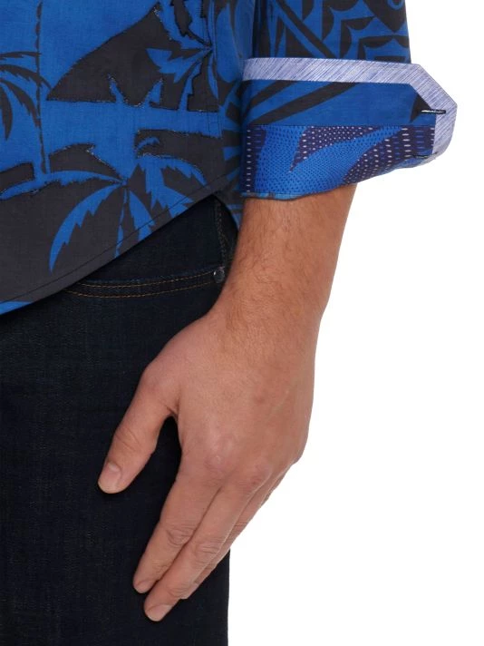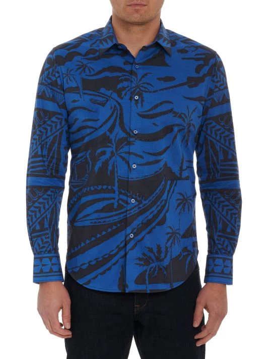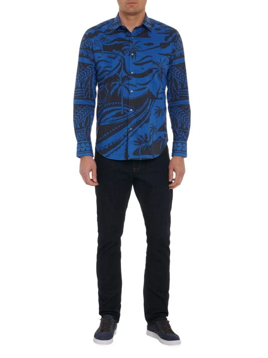 Robert Graham’s 7 Seass Woven Shirt is adorned with a tropical motif and is finished with a point collar and barrel cuffs.