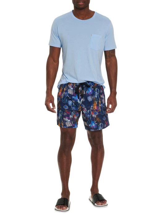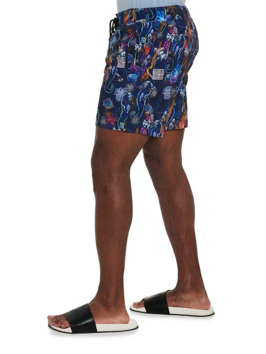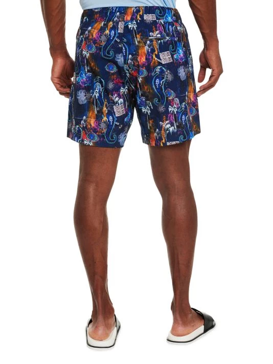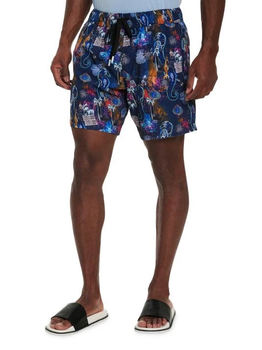 A vibrant under the sea motif covers these classic-cut swim shorts.