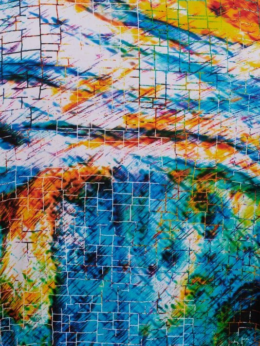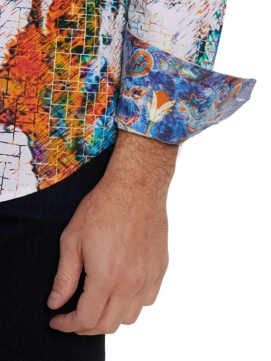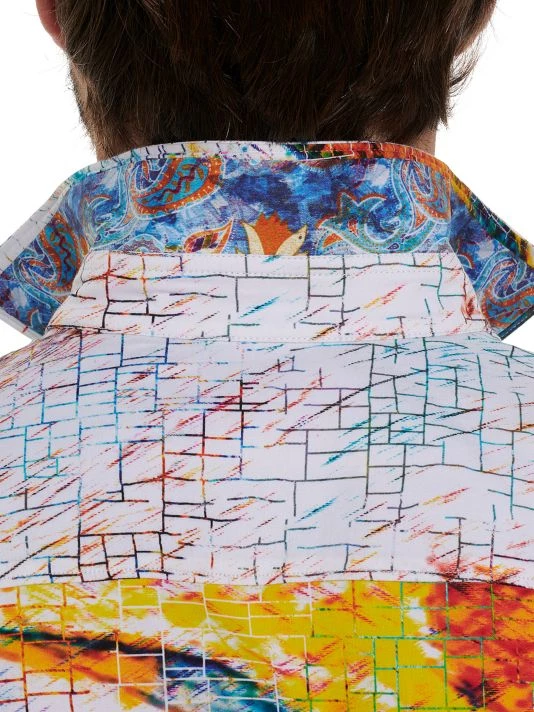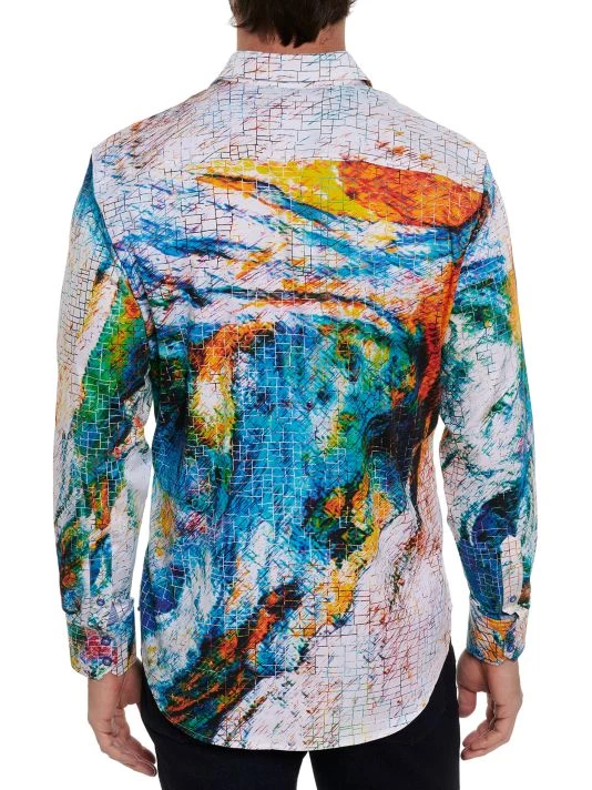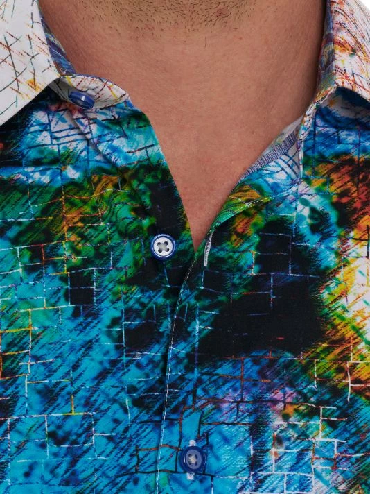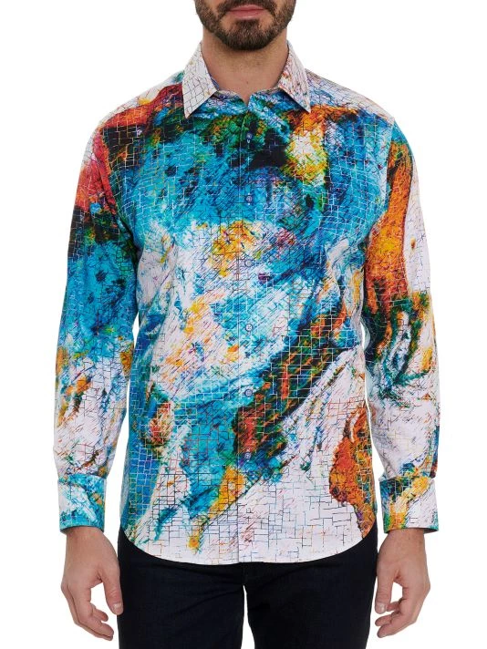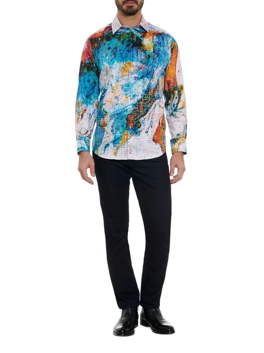 Cosmic watercolors and grid print pair in this statement stretch cotton sport shirt.