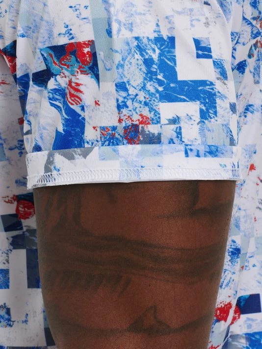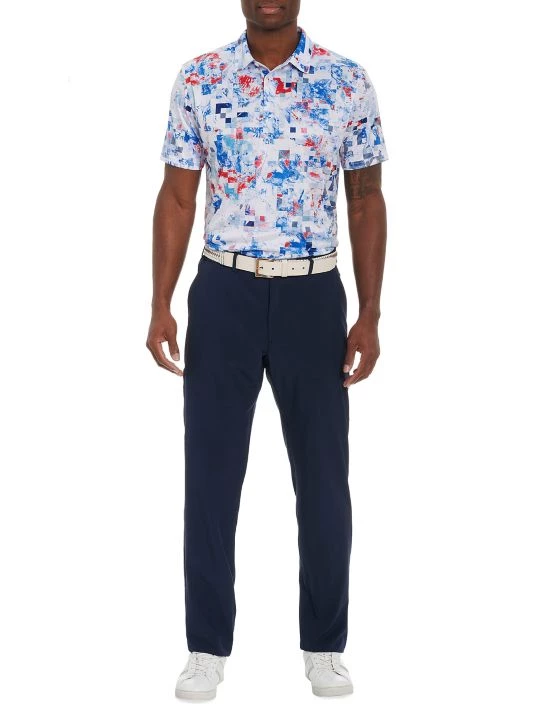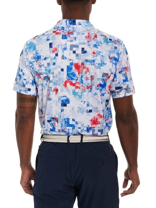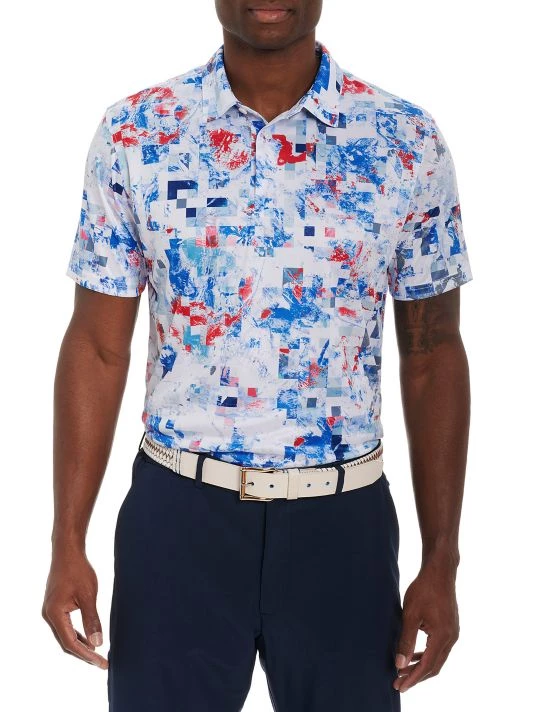 The Winslow Knit Polo shirt by Robert Graham is adorned with a pixelated motif lending a modern twist to the piece’s classic silhouette.