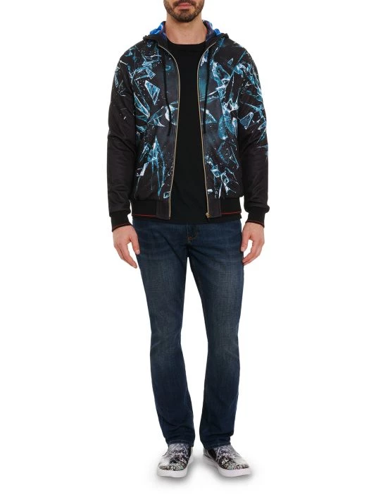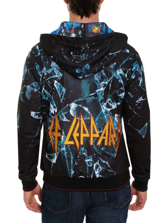From the Robert Graham x Def Leppard Collection. Feel the power and own every moment like you’re center stage in this show stopping mid-weight french terry Robert Graham x Def Leppard two-way zip front hoodie. The shattered glass #wearableart print is directly influenced by the band’s eponymous album cover-find it and many more albums in a cubist motif inside the hood. A hand-embroidered def leppard burns across the back in a fiery russet and gold combo.
